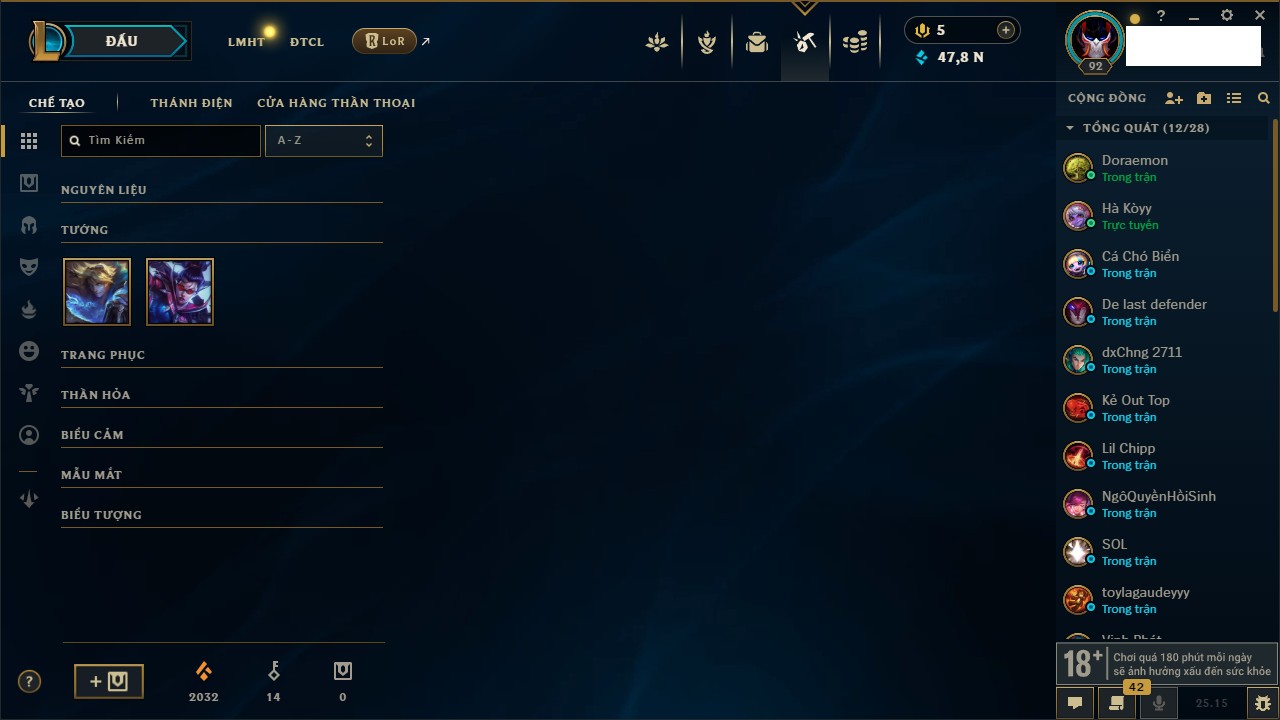 Rank Đơn: Bạch Kim IVKhung: Bạch kimTướng: 171 - Còn 182788 THXTrang Phục: 158Rank ĐTCL: Lục Bảo IVLinh Thú: 56