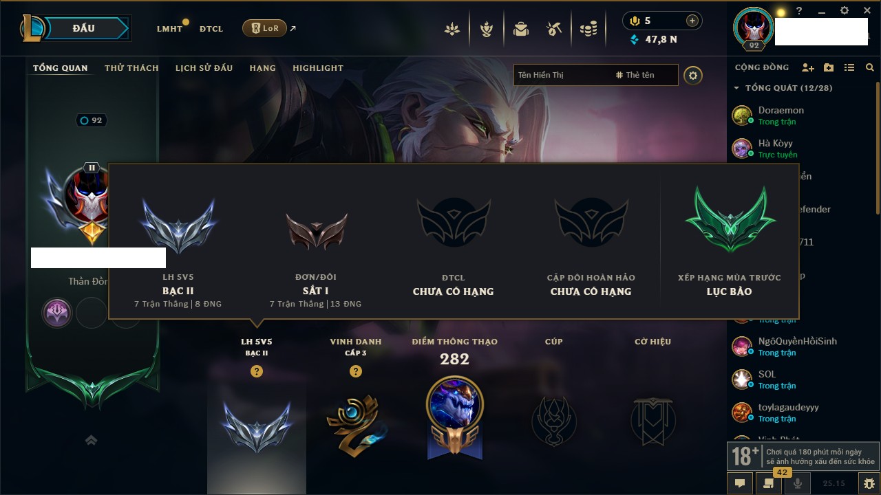 Rank Đơn: Bạc IVKhung: BạcTướng: 171 - Còn 107914 THXTrang Phục: 338Rank ĐTCL: Lục Bảo IVLinh Thú: 120