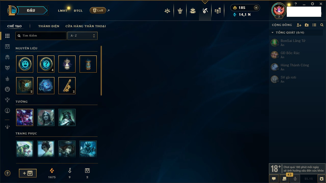 Rank Đơn: Sắt IKhung: Chưa có khungTướng: 171 - Còn 89600 THXTrang Phục: 513Rank ĐTCL: Chưa RankLinh Thú: 57
