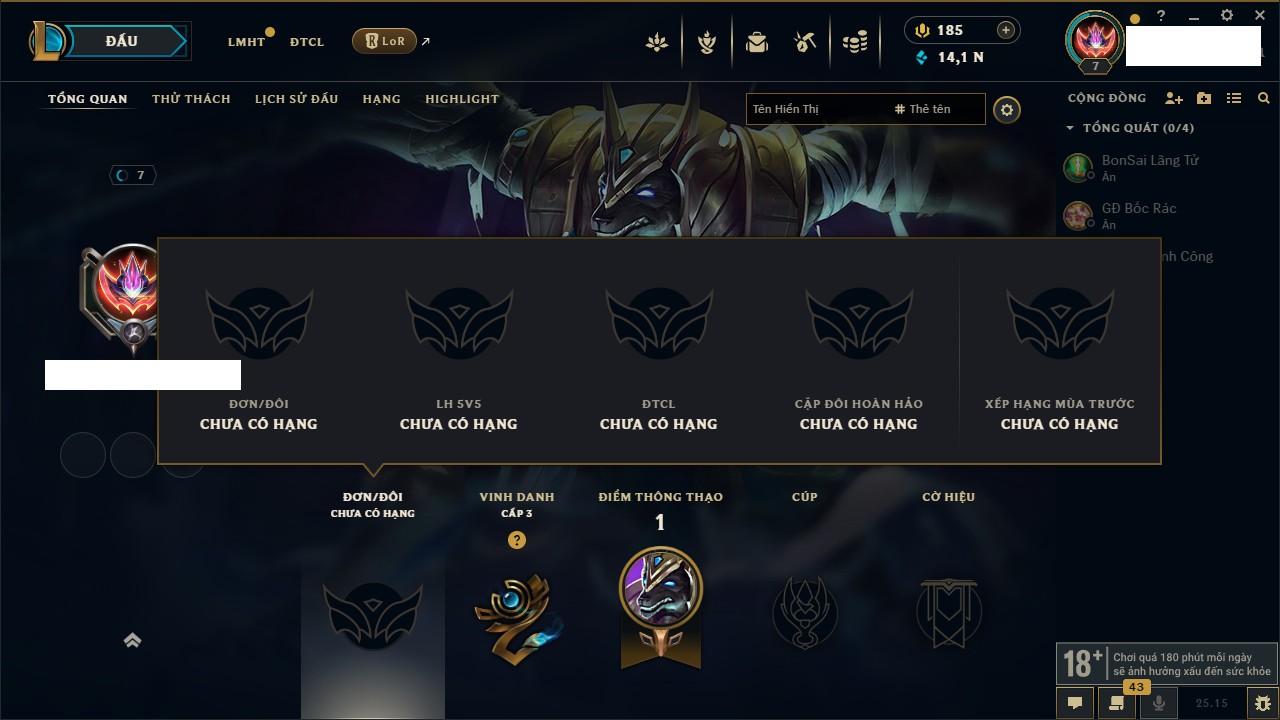 Rank Đơn: Chưa rank mùa nàoKhung: Chưa có khungTướng: 1 - Còn 3000 THXTrang Phục: 0Rank ĐTCL: Vàng ILinh Thú: 6