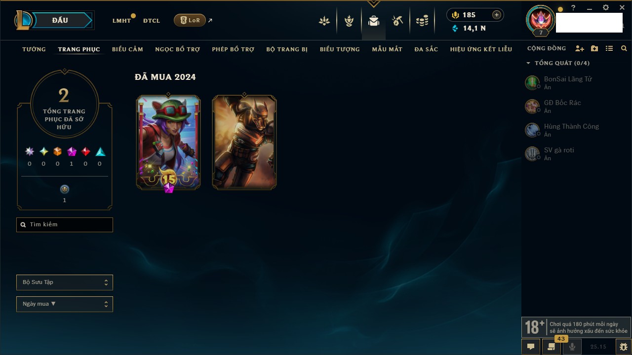 Rank Đơn: Chưa RankKhung: Chưa có khungTướng: 170 - Còn 72514 THXTrang Phục: 202Rank ĐTCL: Chưa RankLinh Thú: 191