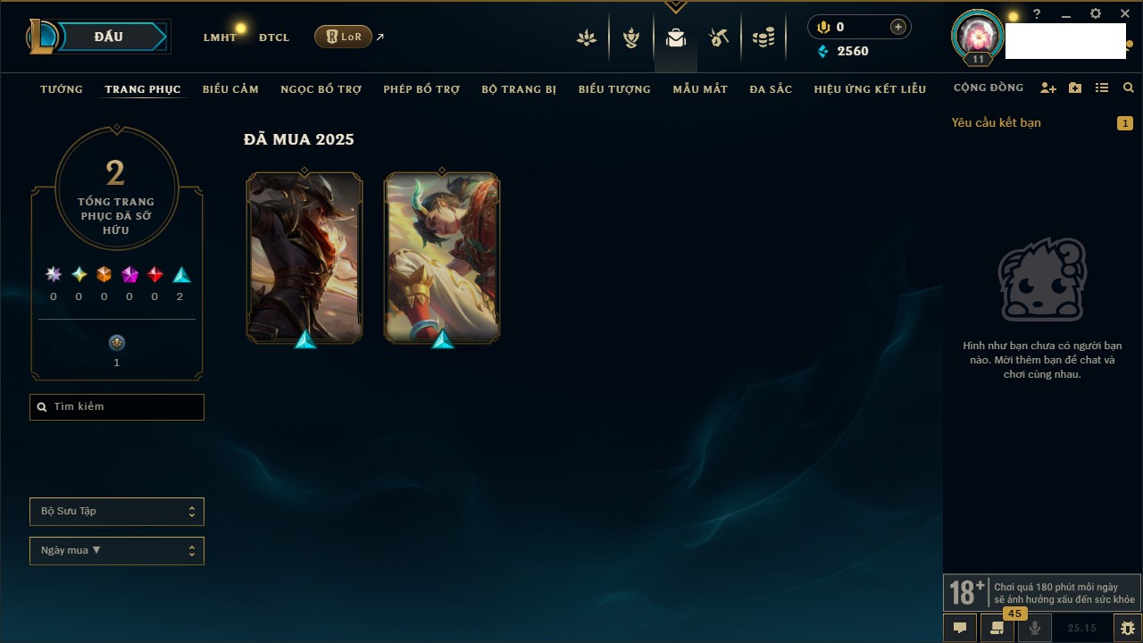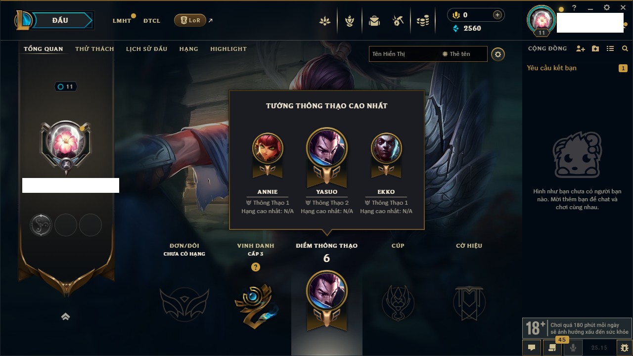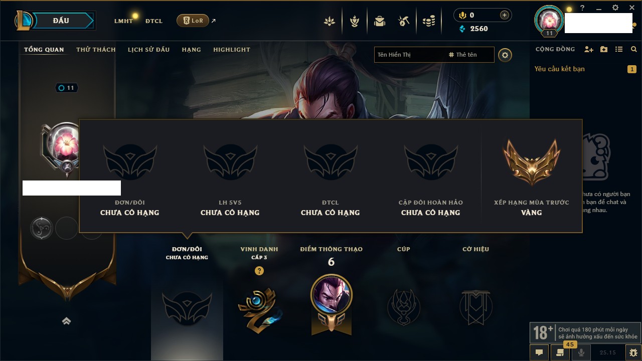 Rank Đơn: Chưa rank mùa nàoKhung: Chưa có khungTướng: 26 - Còn 2560 THXTrang Phục: 2Rank ĐTCL: Chưa RankLinh Thú: 48