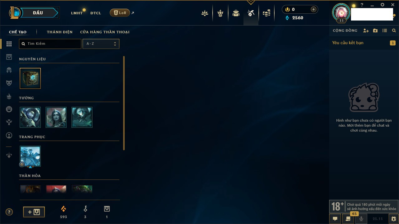 Rank Đơn: Chưa RankKhung: Chưa có khungTướng: 161 - Còn 10060 THXTrang Phục: 591Rank ĐTCL: Chưa RankLinh Thú: 70