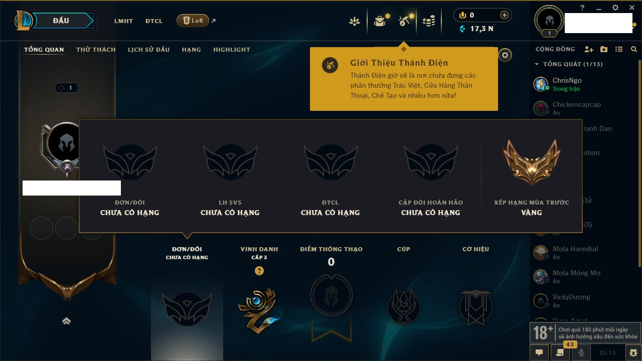 Rank Đơn: Chưa rank mùa nào Khung: Chưa có khung Tướng: 0 - Còn 3000 THX Trang Phục: 0 Rank ĐTCL: Đồng III Linh Thú: 38