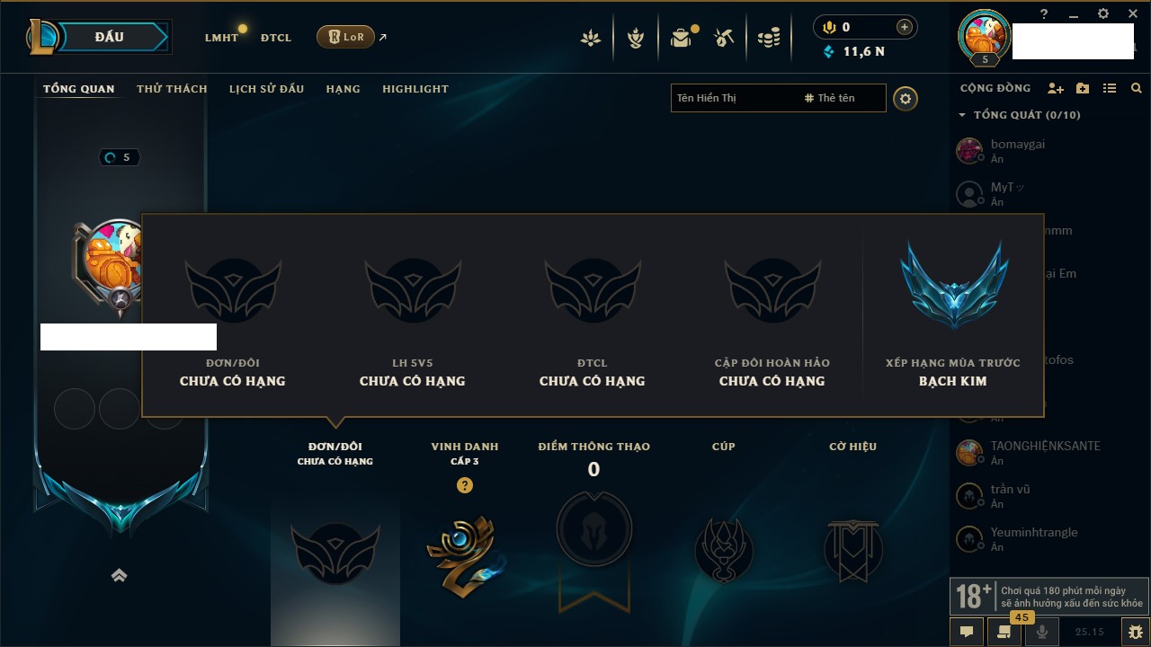Rank Đơn: Chưa rank mùa nào Khung: Chưa có khung Tướng: 48 - Còn 9500 THX Trang Phục: 12 Rank ĐTCL: Kim Cương II Linh Thú: 128