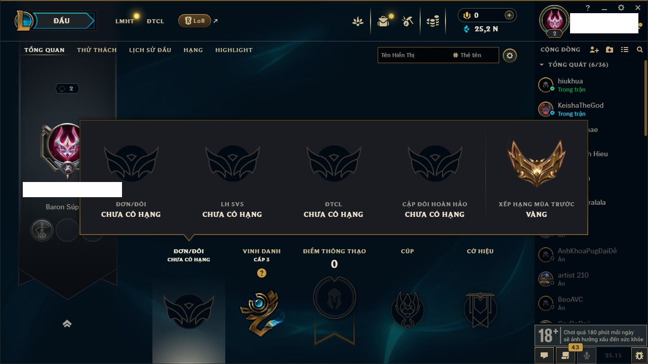 Rank Đơn: Bạc III Khung: Bạc Tướng: 170 - Còn 30078 THX Trang Phục: 225 Rank ĐTCL: Chưa Rank Linh Thú: 138