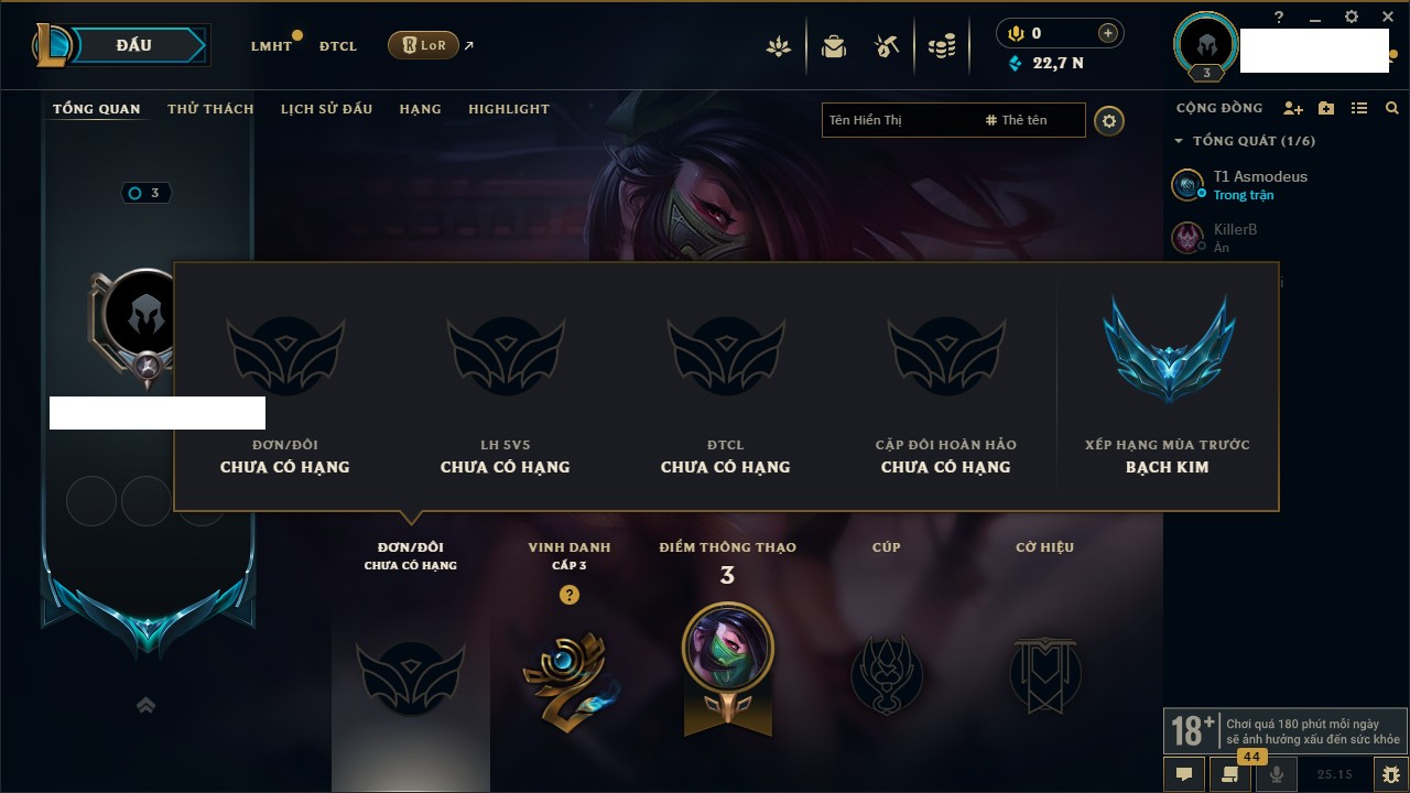 Rank Đơn: Bạc IIIKhung: BạcTướng: 168 - Còn 101710 THXTrang Phục: 184Rank ĐTCL: Chưa RankLinh Thú: 17