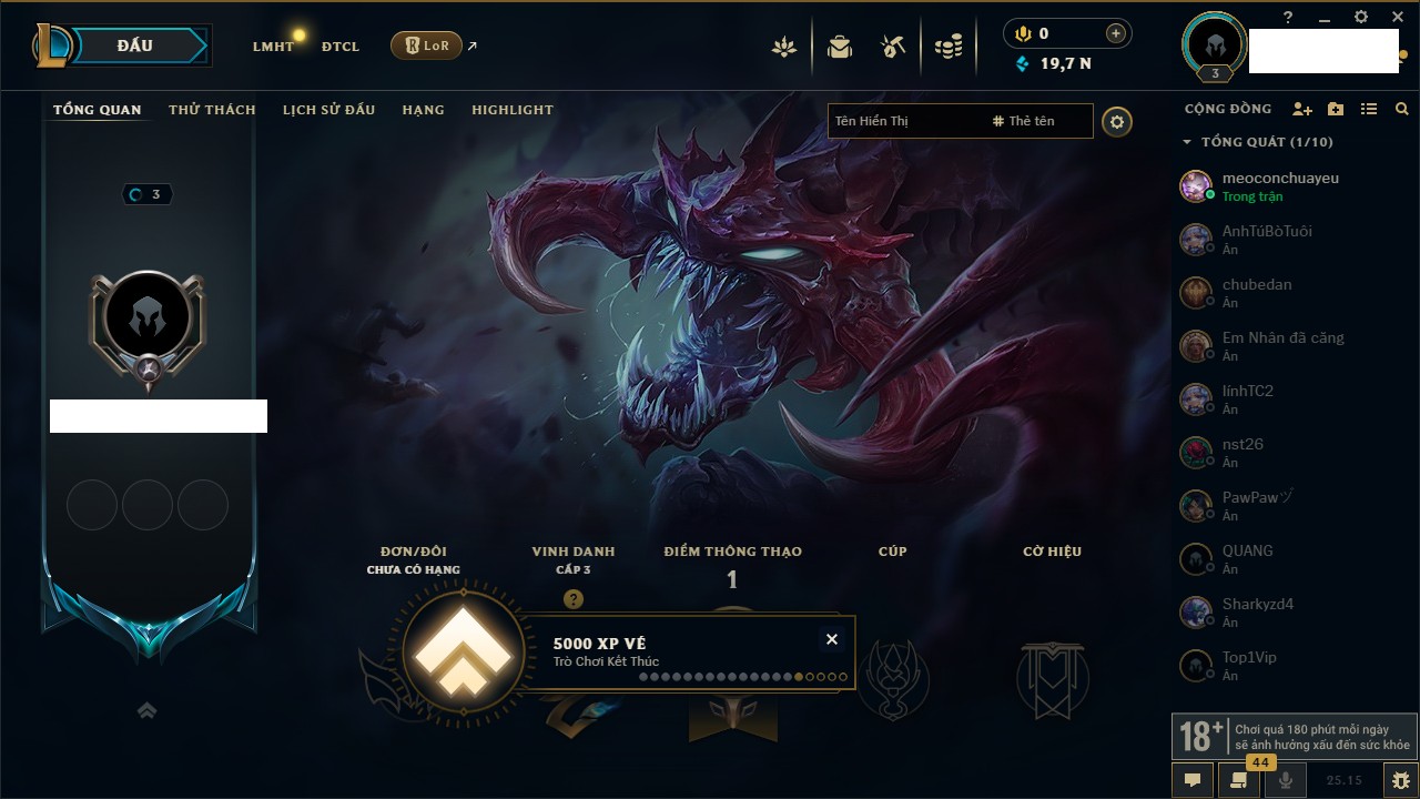 Rank Đơn: Đồng IIKhung: Chưa có khungTướng: 170 - Còn 56487 THXTrang Phục: 90Rank ĐTCL: Chưa RankLinh Thú: 129
