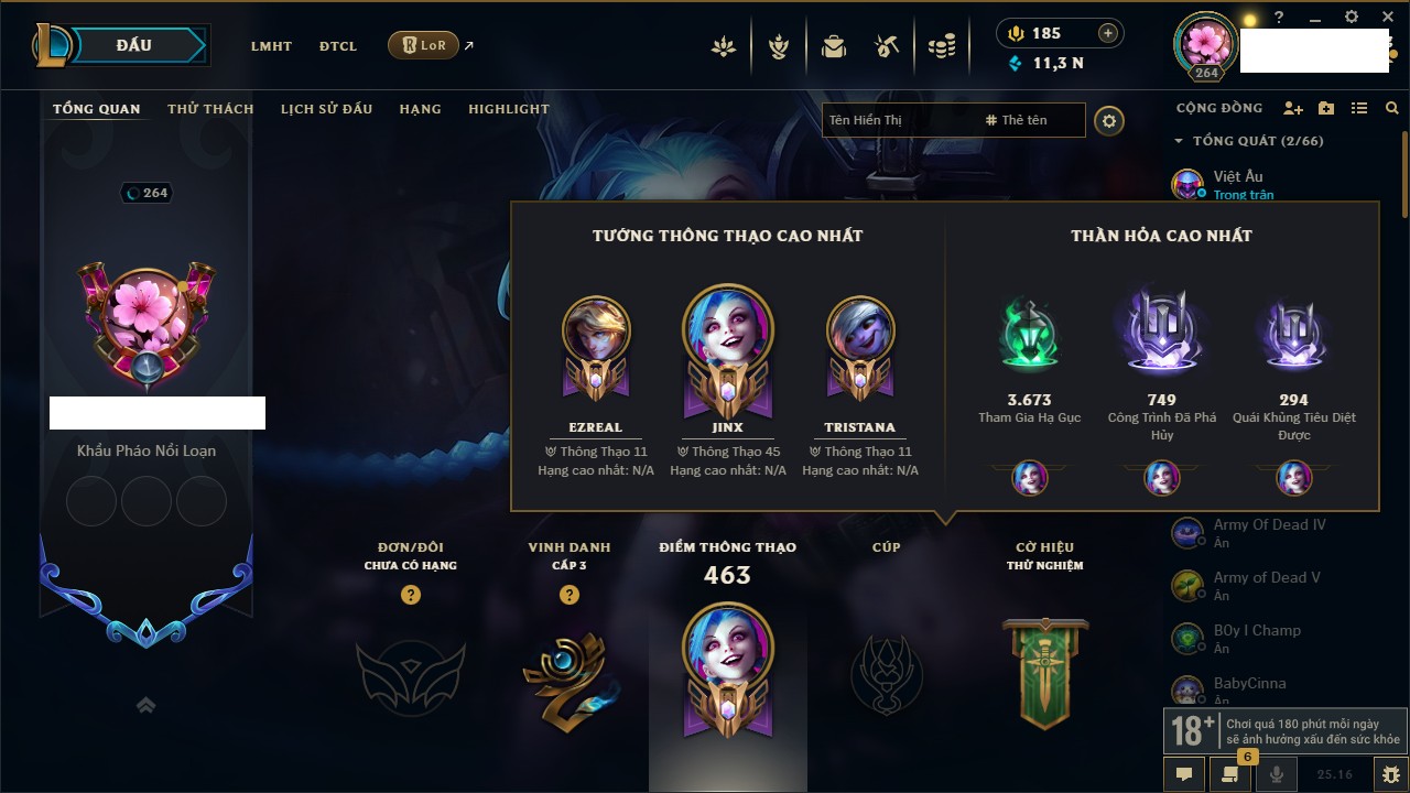 Rank Đơn: Đồng IIKhung: ĐồngTướng: 170 - Còn 95773 THXTrang Phục: 170Rank ĐTCL: Chưa RankLinh Thú: 32