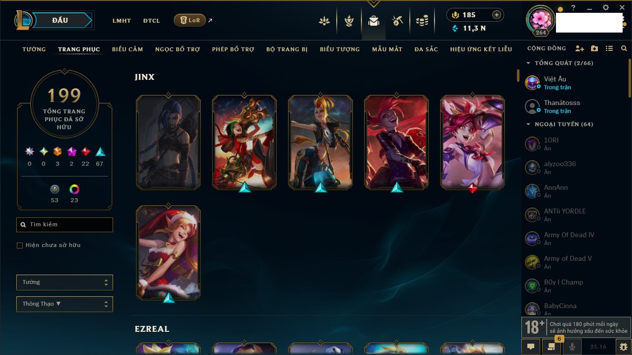 Rank Đơn: Vàng IIIKhung: VàngTướng: 172 - Còn 164704 THXTrang Phục: 255Rank ĐTCL: Kim Cương IVLinh Thú: 156