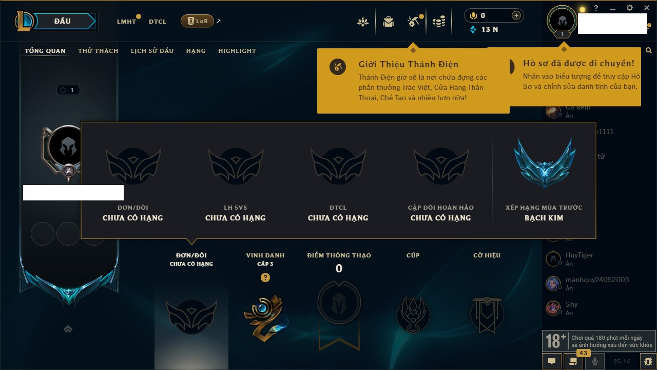 Rank Đơn: Vàng IKhung: Bạch kimTướng: 170 - Còn 212450 THXTrang Phục: 214Rank ĐTCL: Bạch Kim IVLinh Thú: 221