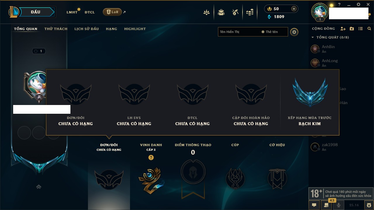 Rank Đơn: Bạch Kim IVKhung: Bạch kimTướng: 171 - Còn 182788 THXTrang Phục: 158Rank ĐTCL: Lục Bảo IVLinh Thú: 56