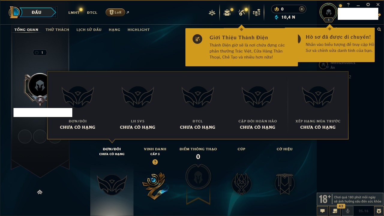 Rank Đơn: Lục Bảo IVKhung: VàngTướng: 171 - Còn 154648 THXTrang Phục: 203Rank ĐTCL: Bạch Kim IVLinh Thú: 69