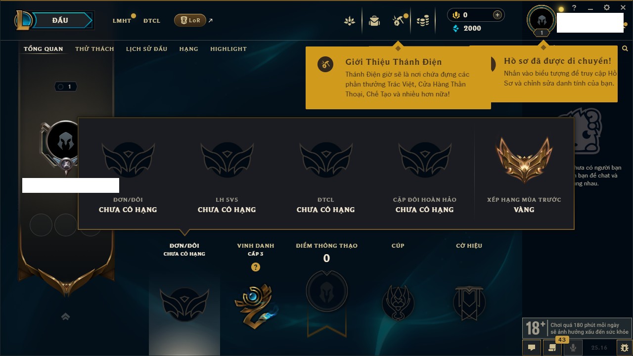 Rank Đơn: Vàng IIIKhung: BạcTướng: 171 - Còn 101359 THXTrang Phục: 88Rank ĐTCL: Kim Cương IVLinh Thú: 200