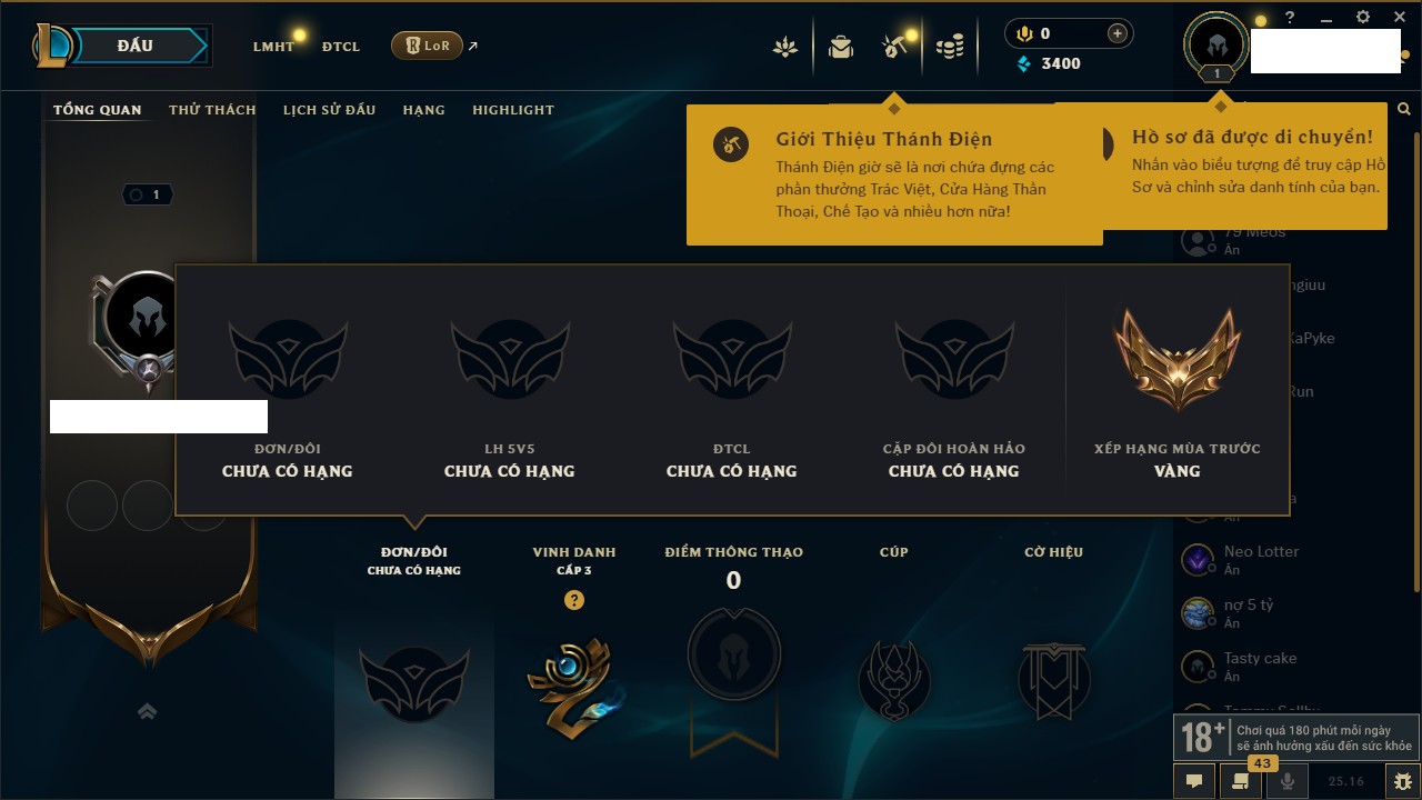 Rank Đơn: Vàng IKhung: Bạch kimTướng: 170 - Còn 212450 THXTrang Phục: 214Rank ĐTCL: Bạch Kim IVLinh Thú: 221