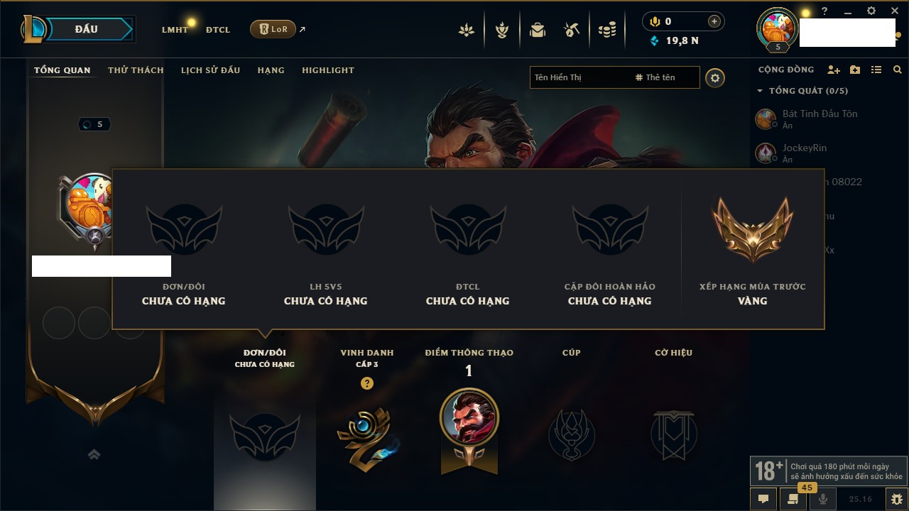 Rank Đơn: Bạc IVKhung: BạcTướng: 171 - Còn 102637 THXTrang Phục: 169Rank ĐTCL: Vàng IILinh Thú: 127