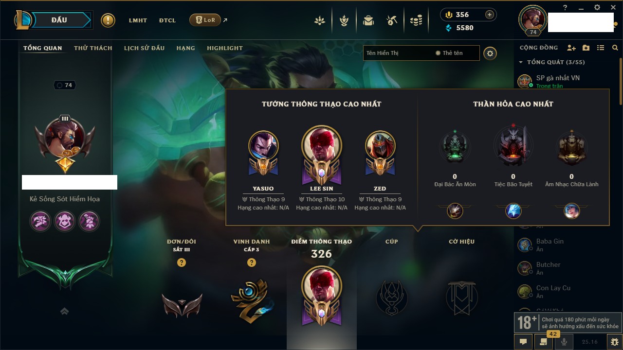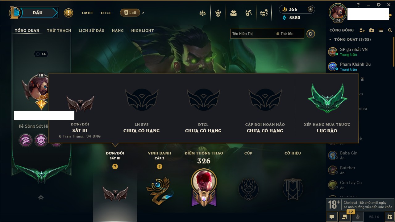 Rank Đơn: Vàng IKhung: BạcTướng: 171 - Còn 60584 THXTrang Phục: 286Rank ĐTCL: Vàng IIILinh Thú: 117