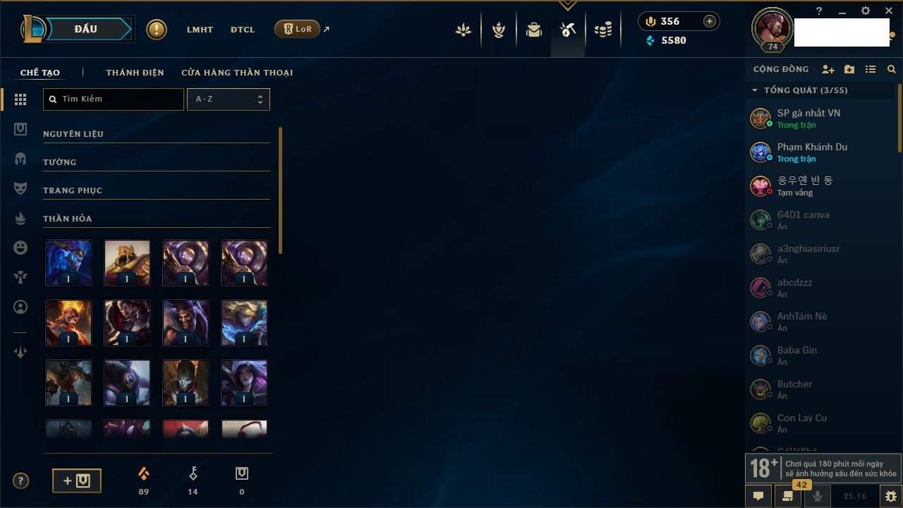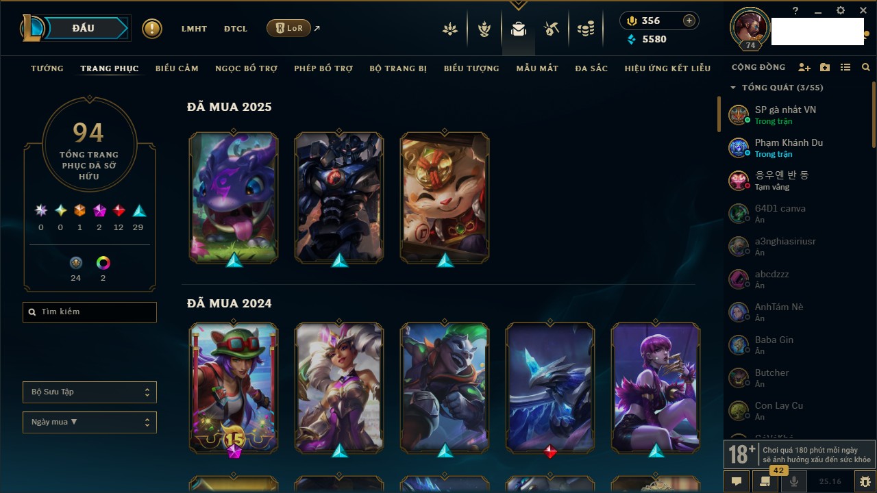 Rank Đơn: Vàng IIIKhung: VàngTướng: 171 - Còn 88128 THXTrang Phục: 329Rank ĐTCL: Chưa RankLinh Thú: 41