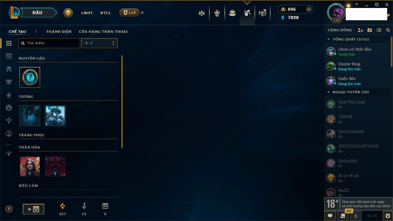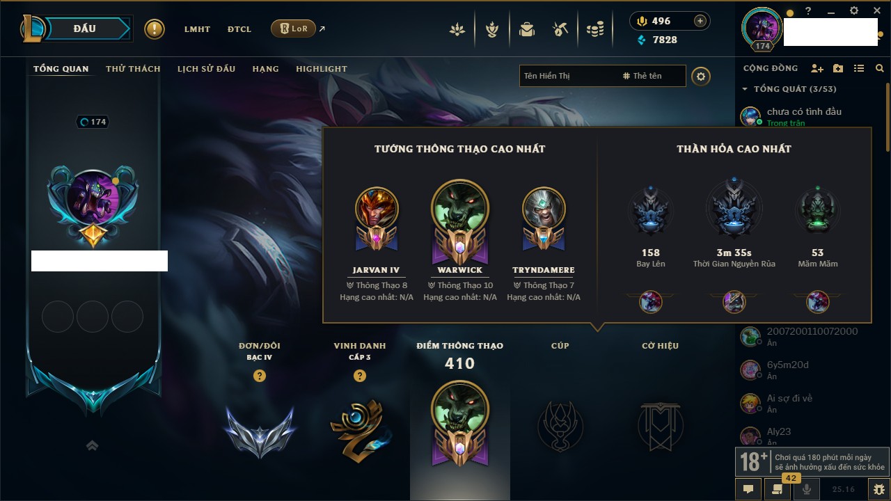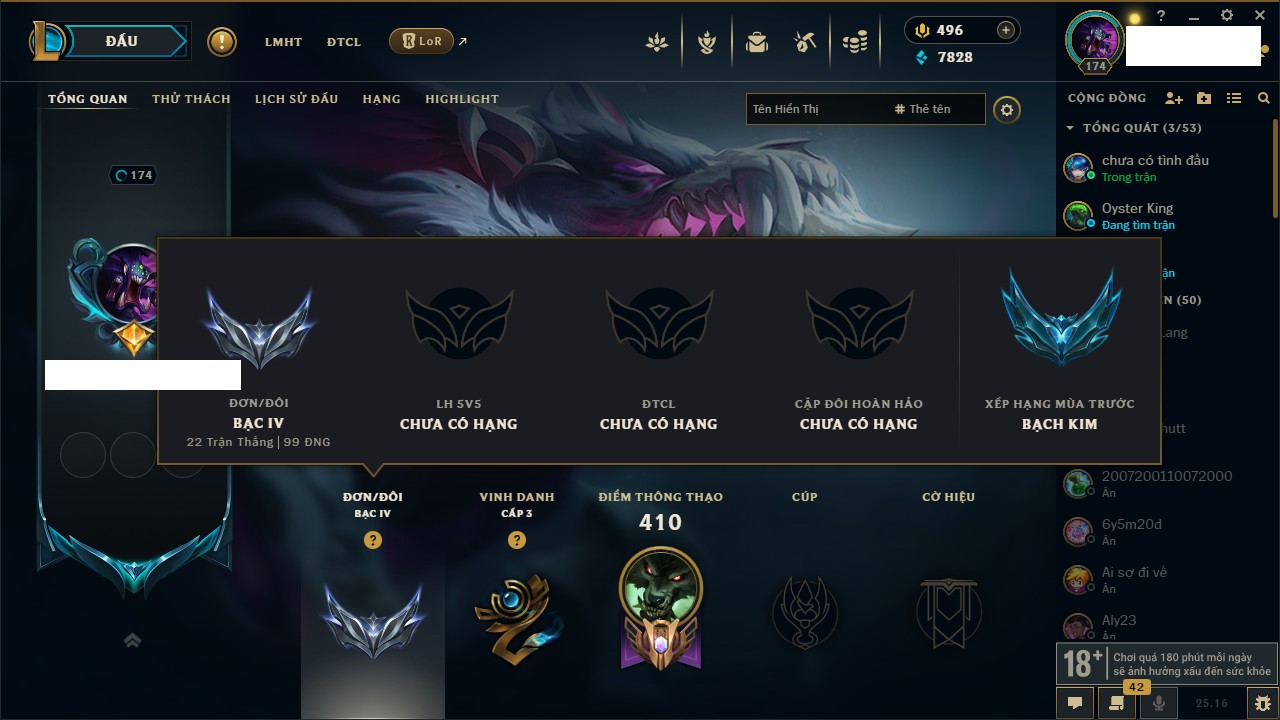 Rank Đơn: Vàng IIIKhung: BạcTướng: 171 - Còn 101359 THXTrang Phục: 88Rank ĐTCL: Kim Cương IVLinh Thú: 200