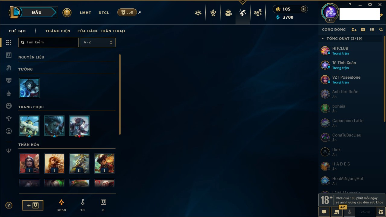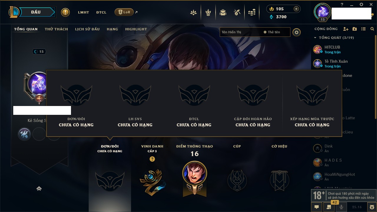 Rank Đơn: Vàng IIKhung: VàngTướng: 171 - Còn 34018 THXTrang Phục: 250Rank ĐTCL: Sắt IILinh Thú: 19