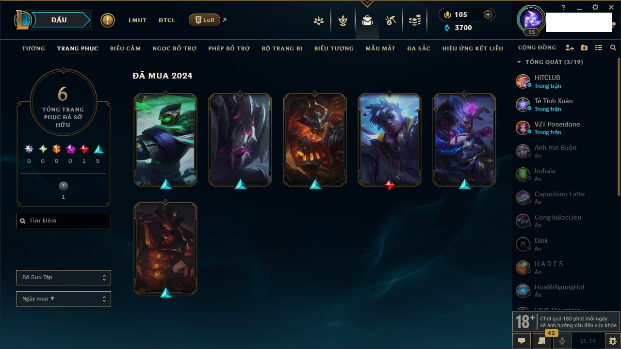 Rank Đơn: Vàng IIIKhung: VàngTướng: 161 - Còn 162202 THXTrang Phục: 179Rank ĐTCL: Chưa RankLinh Thú: 20