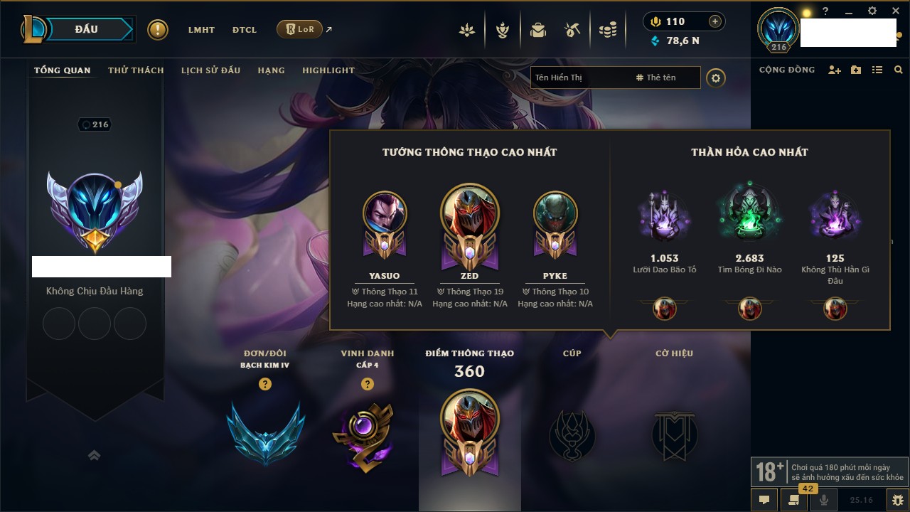 Rank Đơn: Đồng IVKhung: ĐồngTướng: 167 - Còn 28219 THXTrang Phục: 187Rank ĐTCL: Chưa RankLinh Thú: 112
