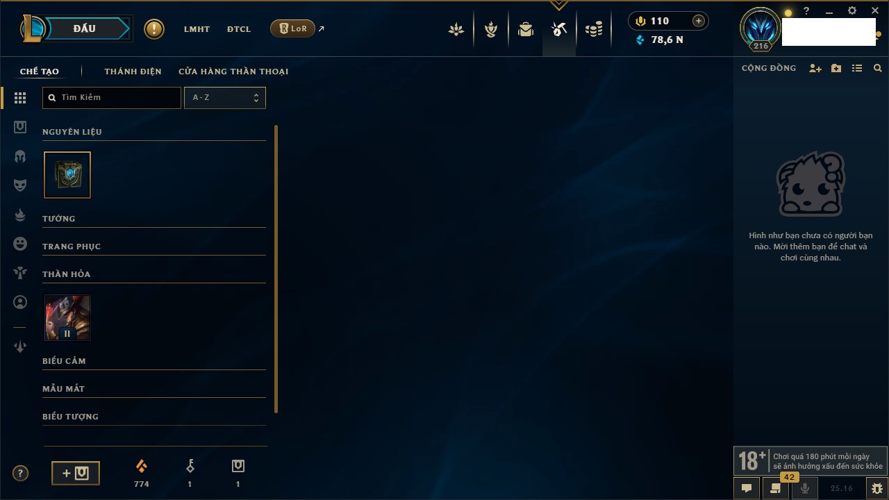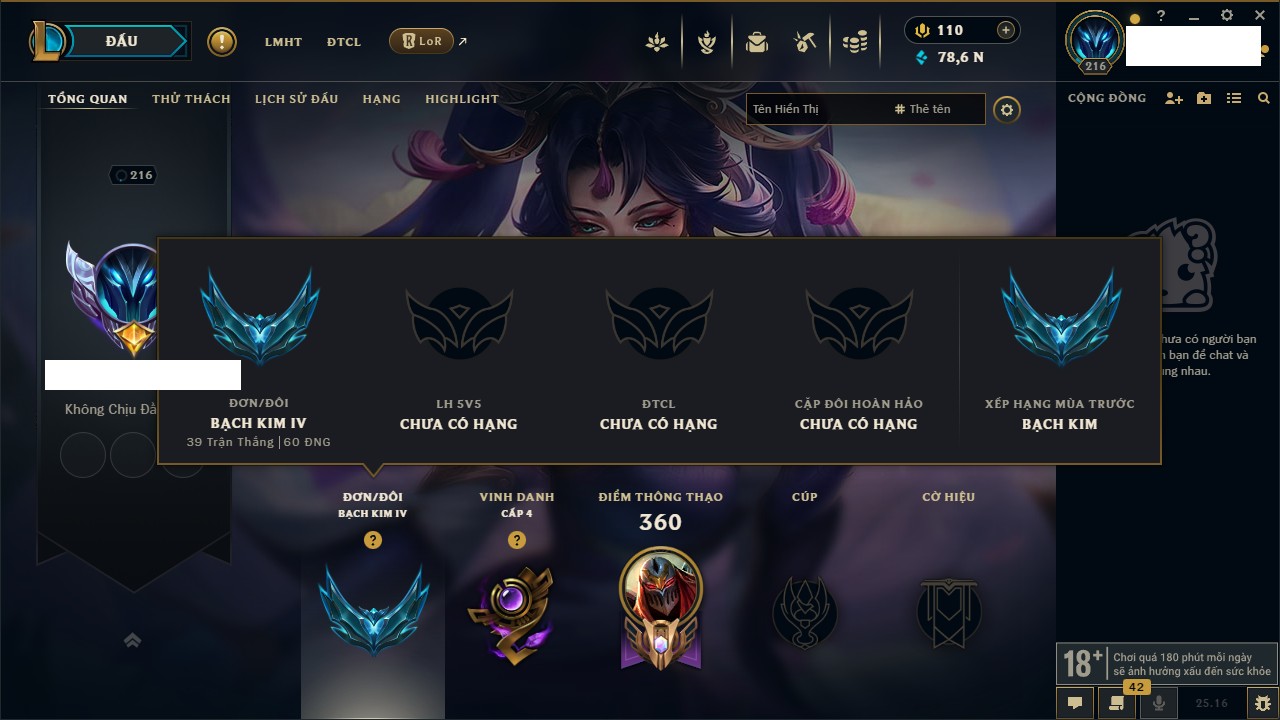 Rank Đơn: Vàng IIIKhung: BạcTướng: 171 - Còn 101359 THXTrang Phục: 88Rank ĐTCL: Kim Cương IVLinh Thú: 200