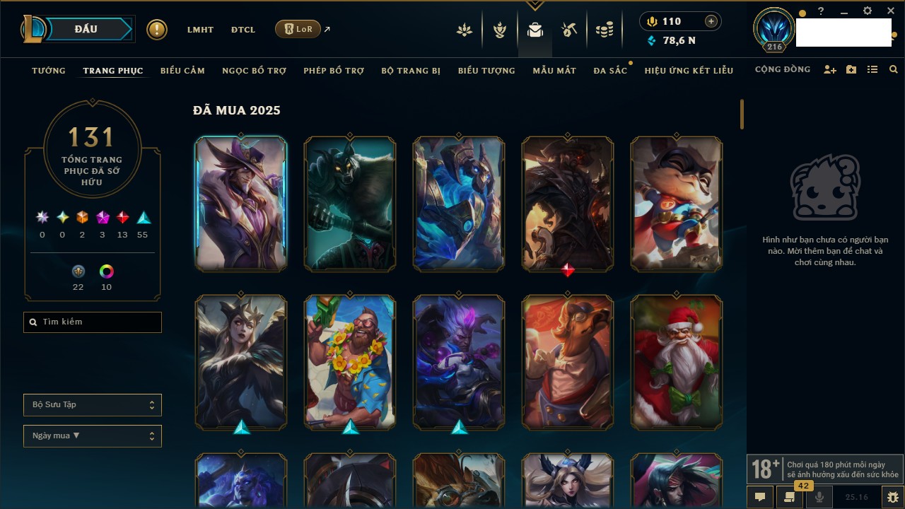Rank Đơn: Đồng IKhung: ĐồngTướng: 168 - Còn 11447 THXTrang Phục: 245Rank ĐTCL: Chưa RankLinh Thú: 53