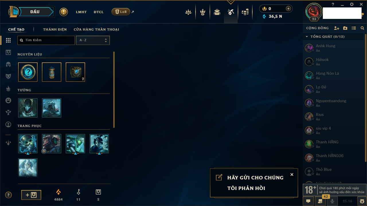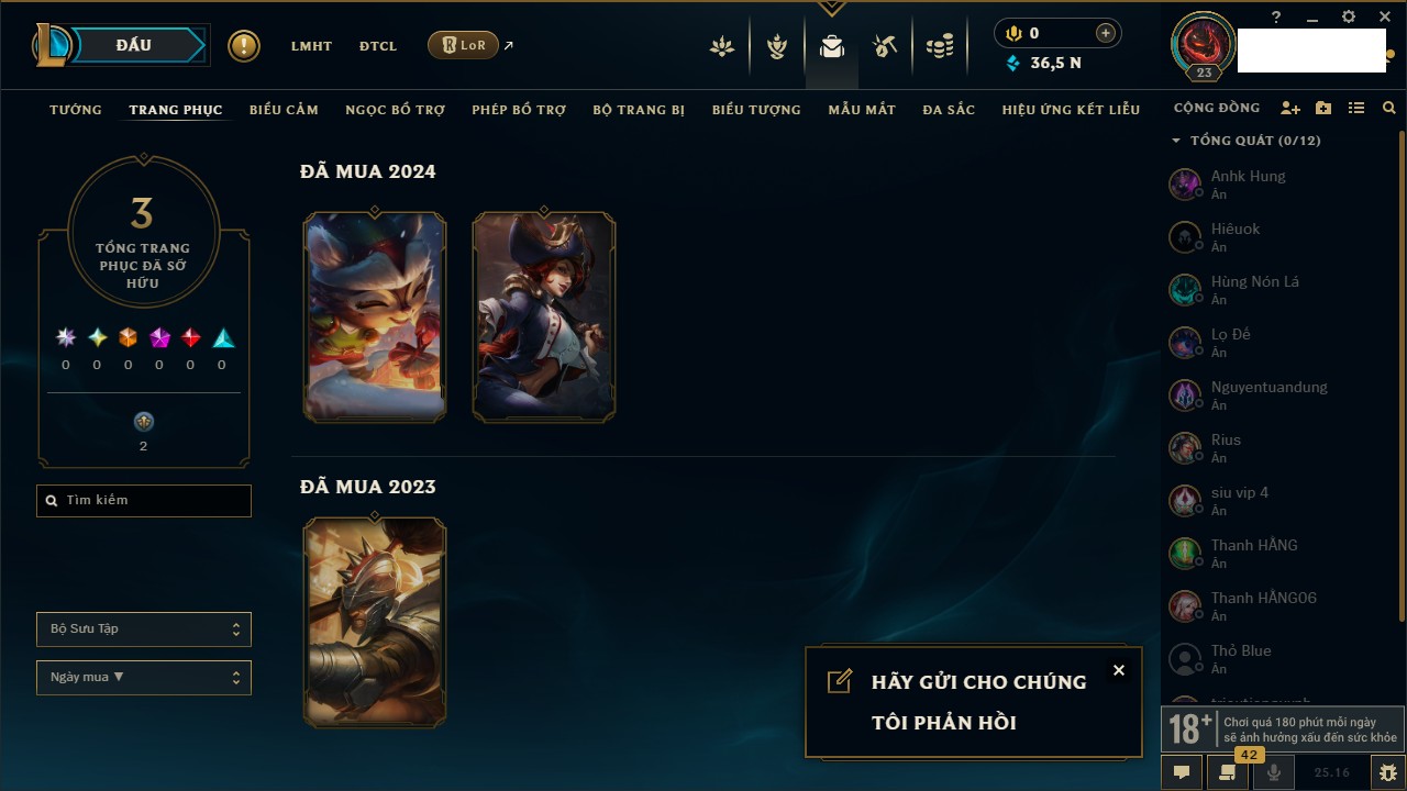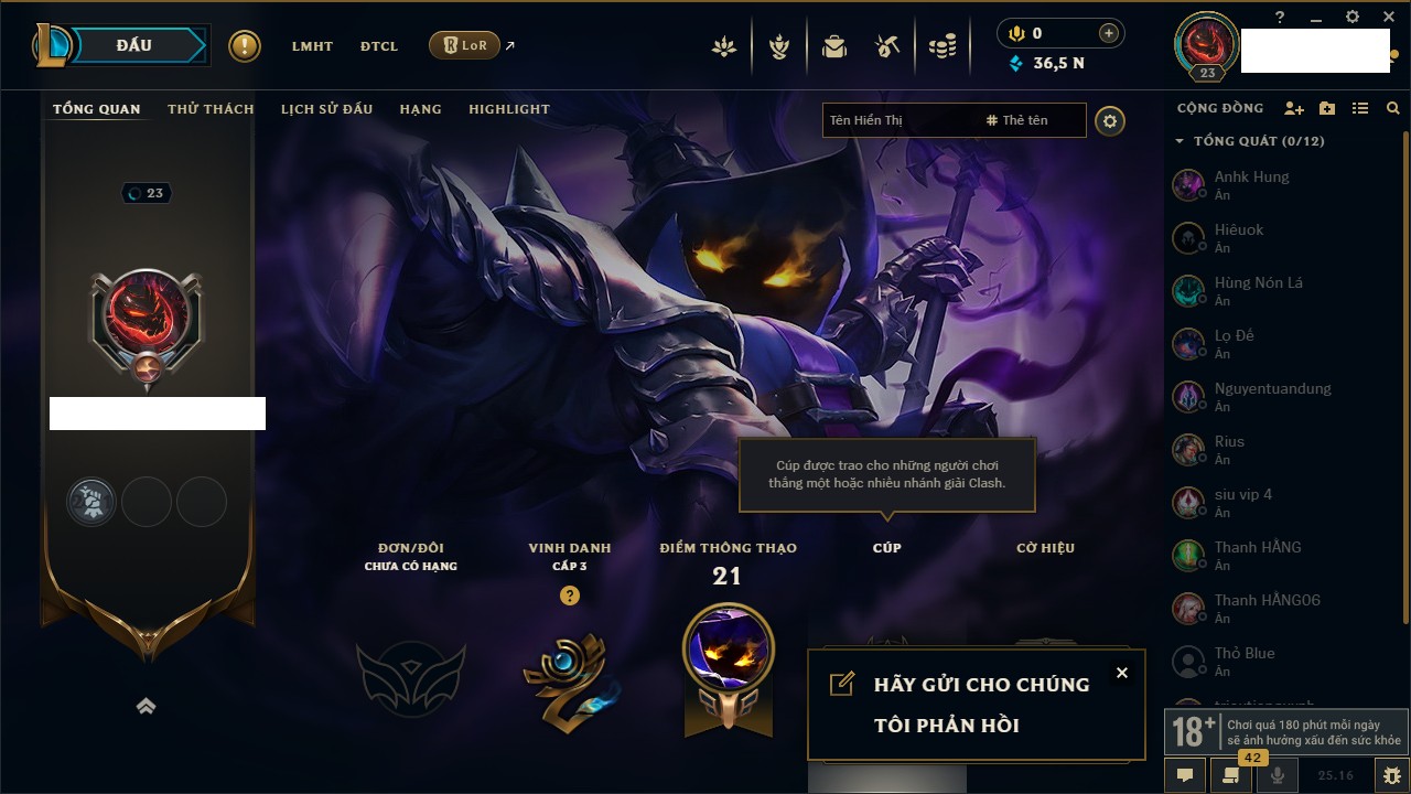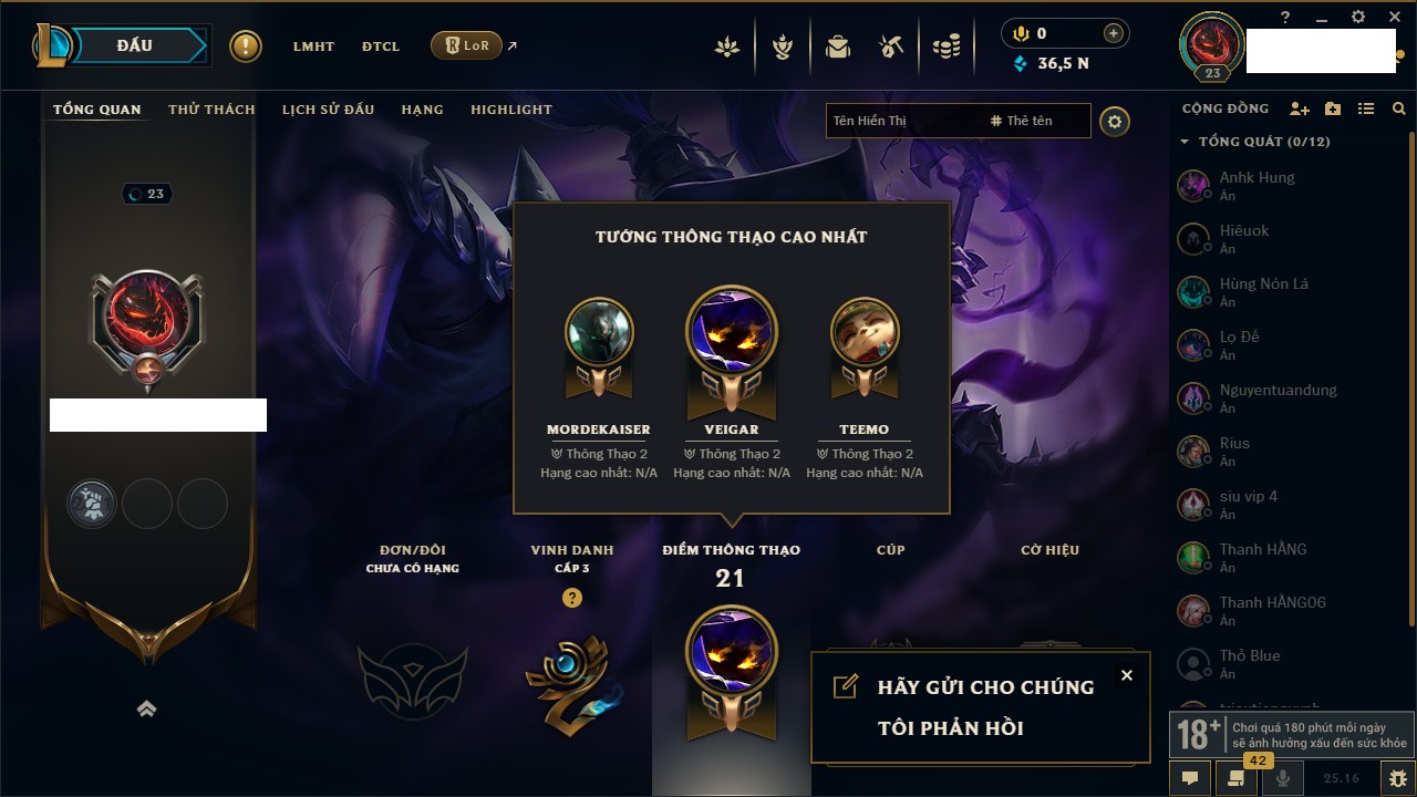 Rank Đơn: Chưa rank mùa nào Khung: Chưa có khung Tướng: 117 - Còn 36585 THX Trang Phục: 3 Rank ĐTCL: Chưa Rank Linh Thú: 58