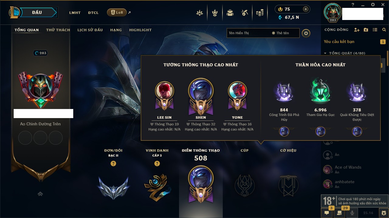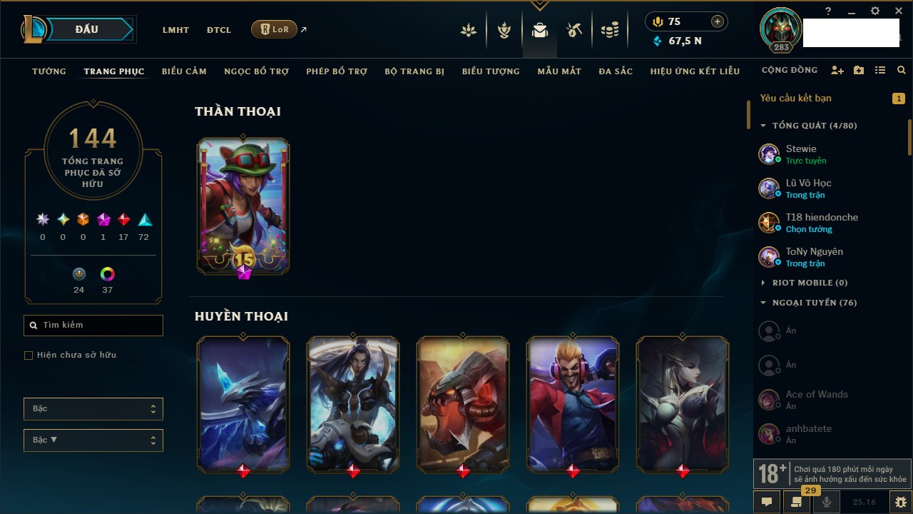 Rank Đơn: Vàng IKhung: Bạch kimTướng: 170 - Còn 212450 THXTrang Phục: 214Rank ĐTCL: Bạch Kim IVLinh Thú: 221