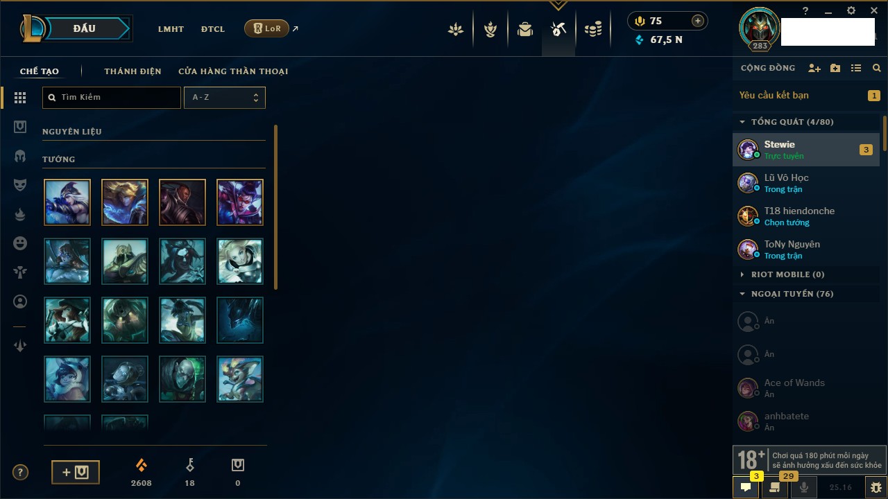 Rank Đơn: Bạch Kim IVKhung: Bạch kimTướng: 171 - Còn 182788 THXTrang Phục: 158Rank ĐTCL: Lục Bảo IVLinh Thú: 56
