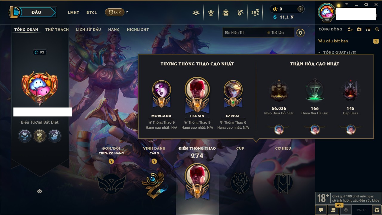 Rank Đơn: Vàng IIKhung: Bạch kimTướng: 172 - Còn 123420 THXTrang Phục: 231Rank ĐTCL: Bạch Kim IVLinh Thú: 213