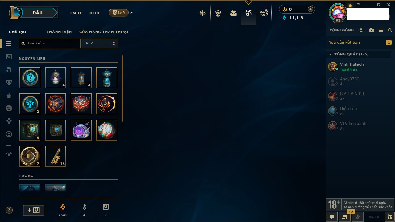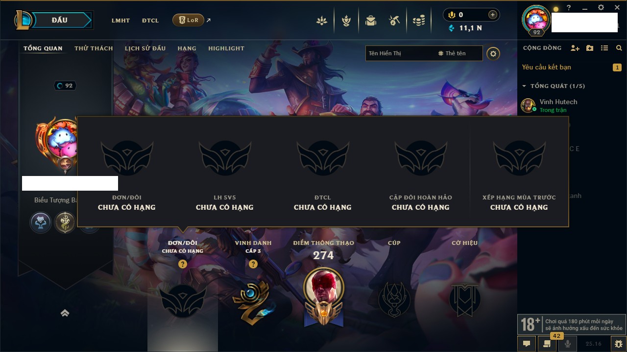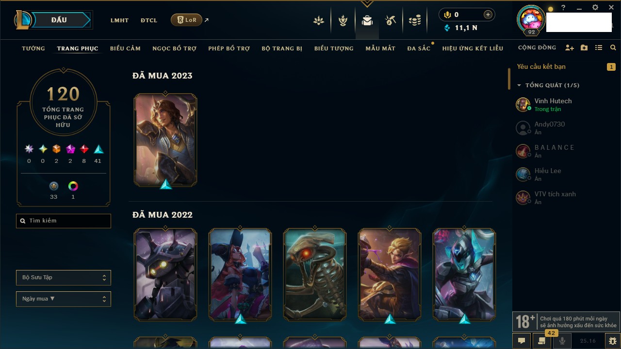 Rank Đơn: Vàng IIIKhung: VàngTướng: 172 - Còn 200315 THXTrang Phục: 87Rank ĐTCL: Chưa RankLinh Thú: 136