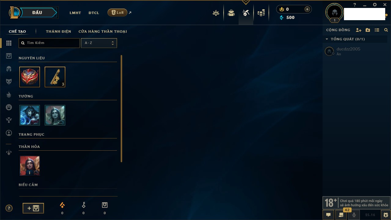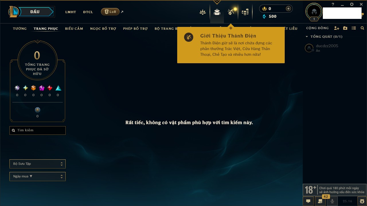 Rank Đơn: Chưa rank mùa nào Khung: Chưa có khung Tướng: 0 - Còn 17050 THX Trang Phục: 1 Rank ĐTCL: Chưa Rank Linh Thú: 87
