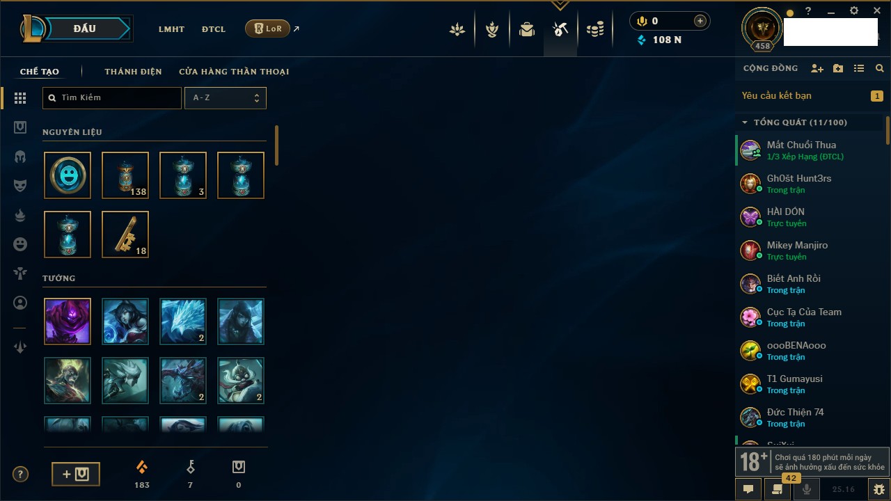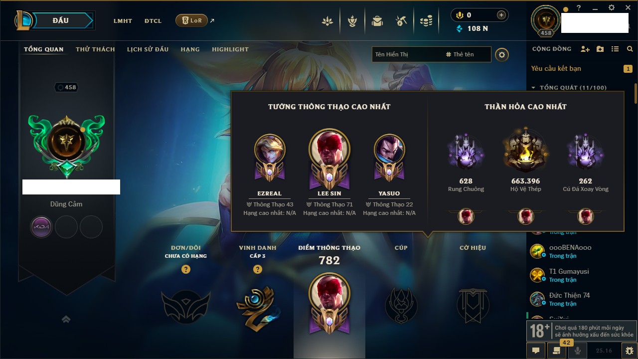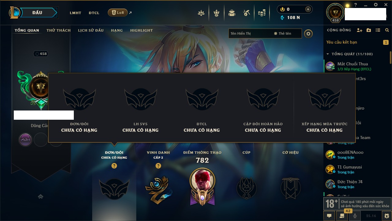 Rank Đơn: Bạch Kim III Khung: Bạch kim Tướng: 171 - Còn 79166 THX Trang Phục: 441 Rank ĐTCL: Bạc IV Linh Thú: 354