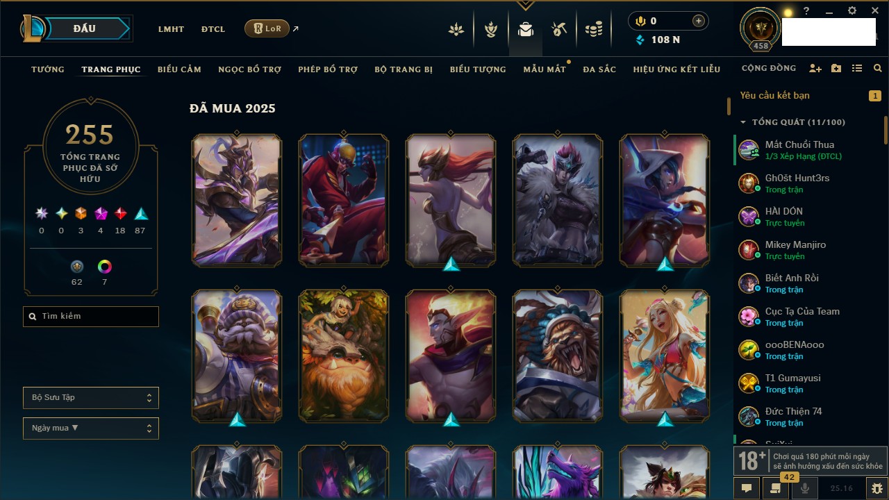 Rank Đơn: Chưa rank mùa nào Khung: Chưa có khung Tướng: 16 - Còn 25584 THX Trang Phục: 3 Rank ĐTCL: Bạch Kim IV Linh Thú: 155