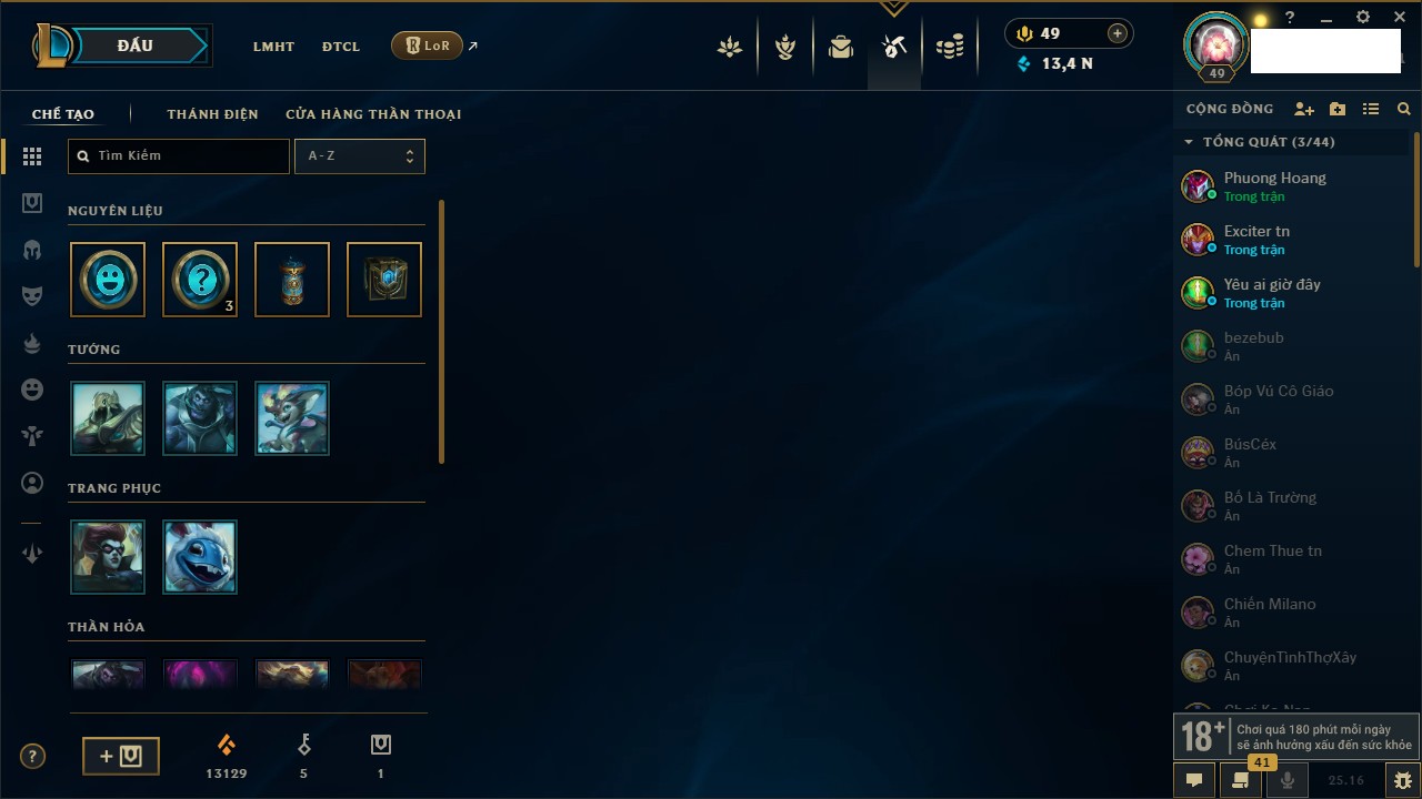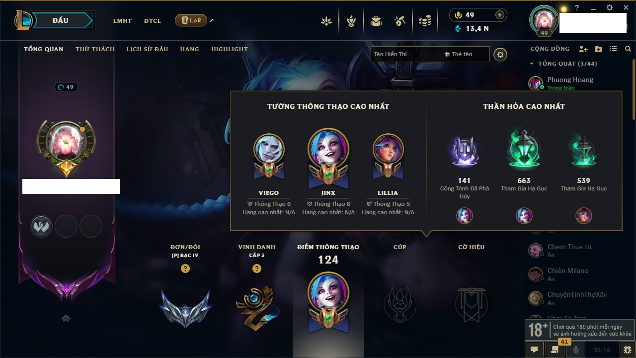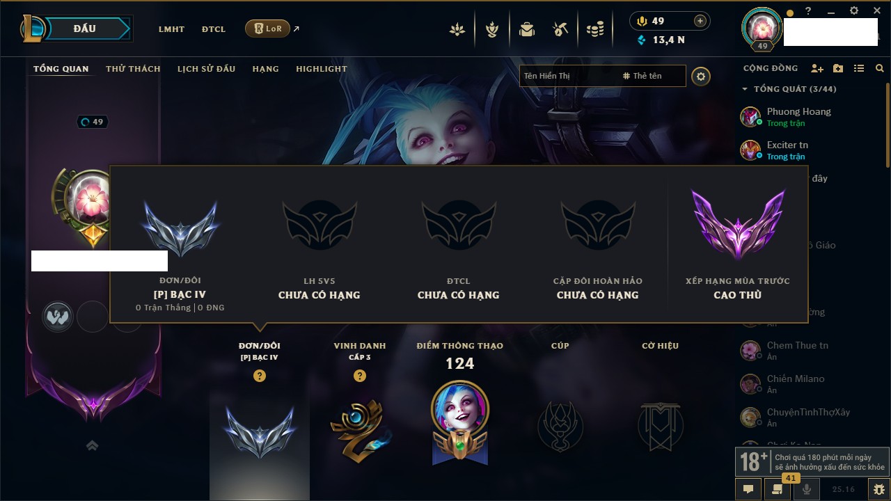 Rank Đơn: Bạch Kim IV Khung: Bạch kim Tướng: 170 - Còn 95523 THX Trang Phục: 243 Rank ĐTCL: Chưa Rank Linh Thú: 150
