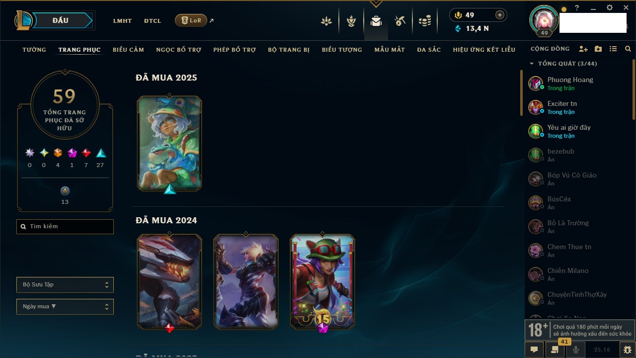 Rank Đơn: Chưa rank mùa nào Khung: Chưa có khung Tướng: 0 - Còn 3000 THX Trang Phục: 0 Rank ĐTCL: Đồng III Linh Thú: 38