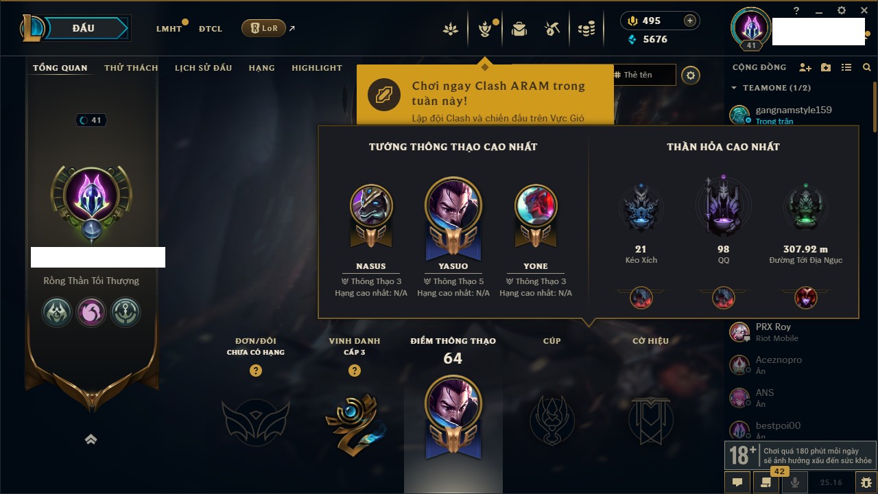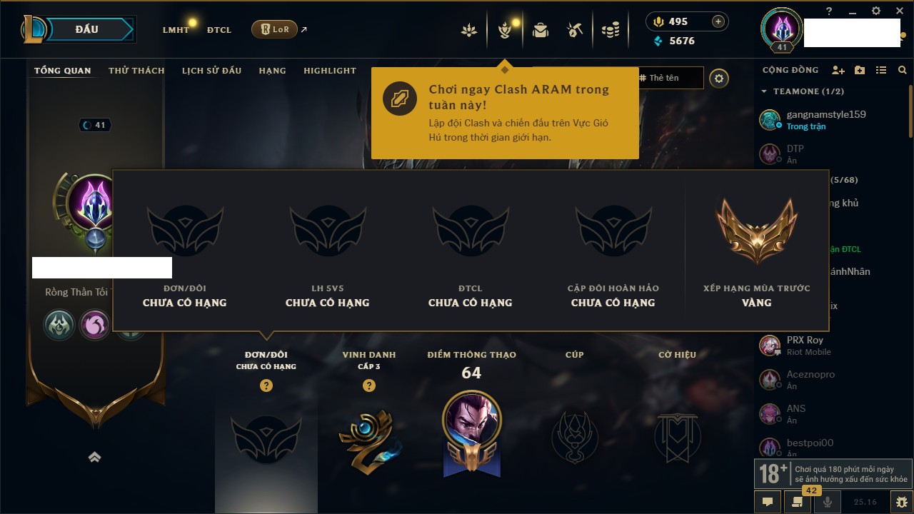 Rank Đơn: Bạc IVKhung: BạcTướng: 171 - Còn 7819 THXTrang Phục: 243Rank ĐTCL: Chưa RankLinh Thú: 102