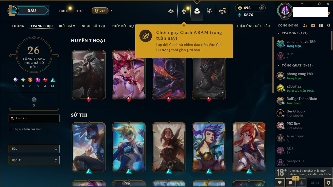 Rank Đơn: Vàng IIIKhung: VàngTướng: 161 - Còn 162202 THXTrang Phục: 179Rank ĐTCL: Chưa RankLinh Thú: 20