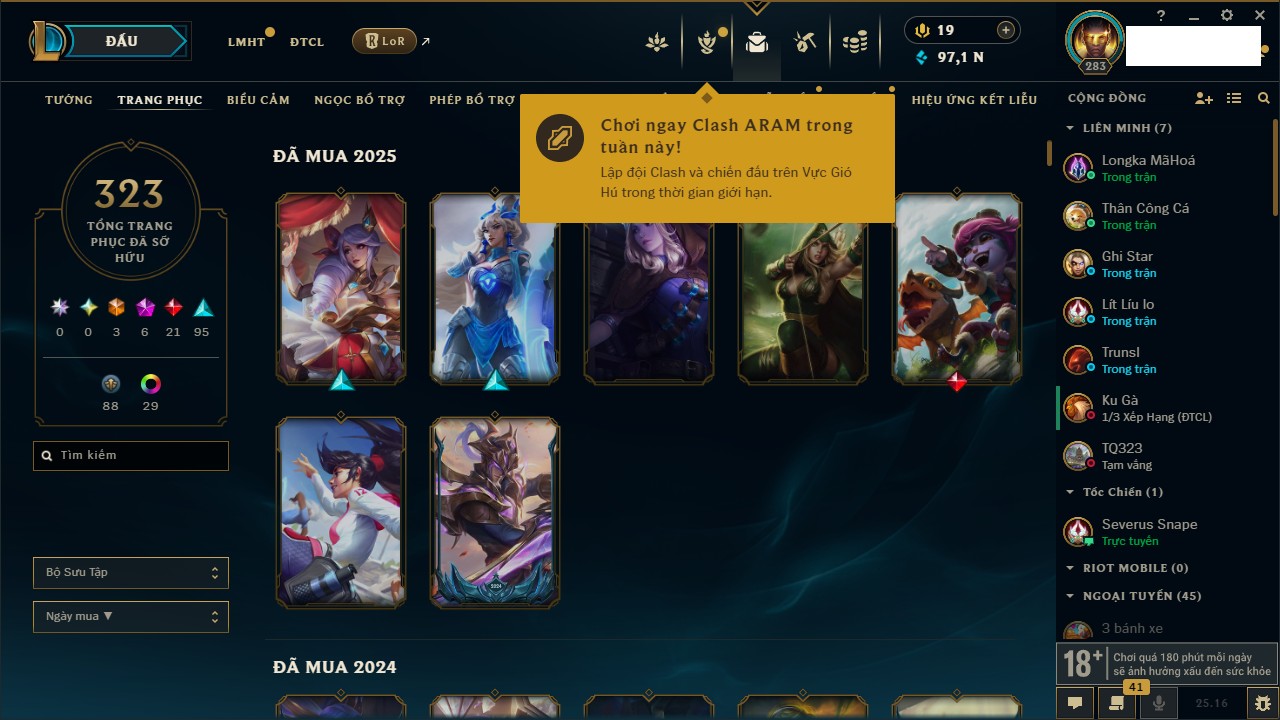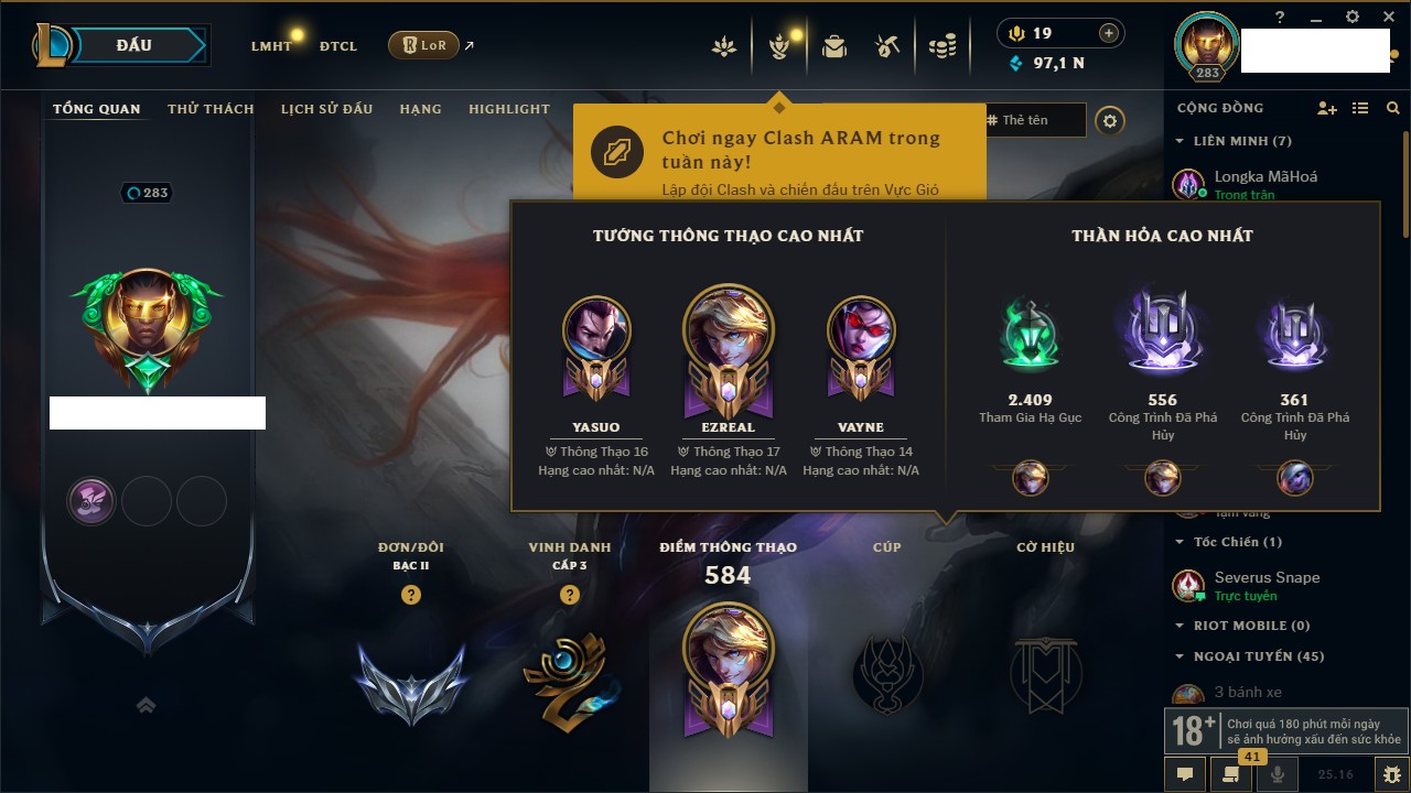 Rank Đơn: Vàng III Khung: Vàng Tướng: 171 - Còn 91047 THX Trang Phục: 98 Rank ĐTCL: Bạch Kim IV Linh Thú: 281