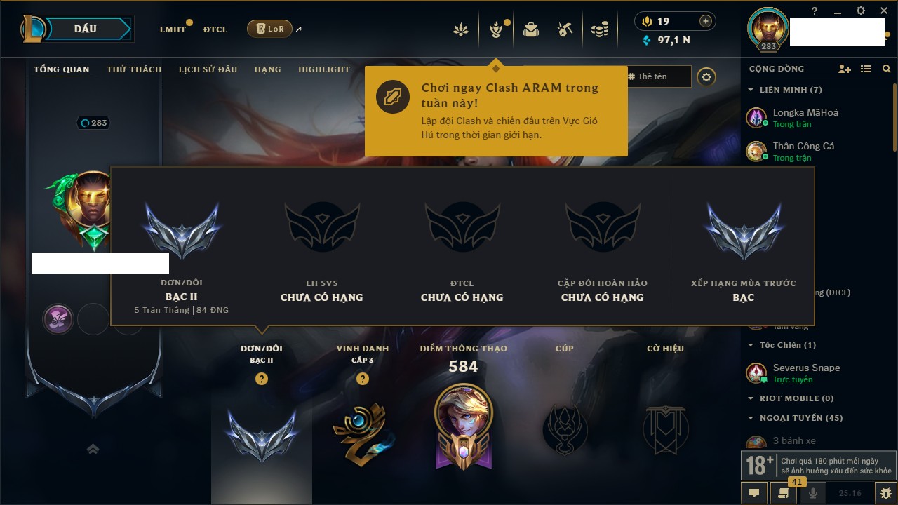 Rank Đơn: Bạc III Khung: Bạc Tướng: 170 - Còn 30078 THX Trang Phục: 225 Rank ĐTCL: Chưa Rank Linh Thú: 138