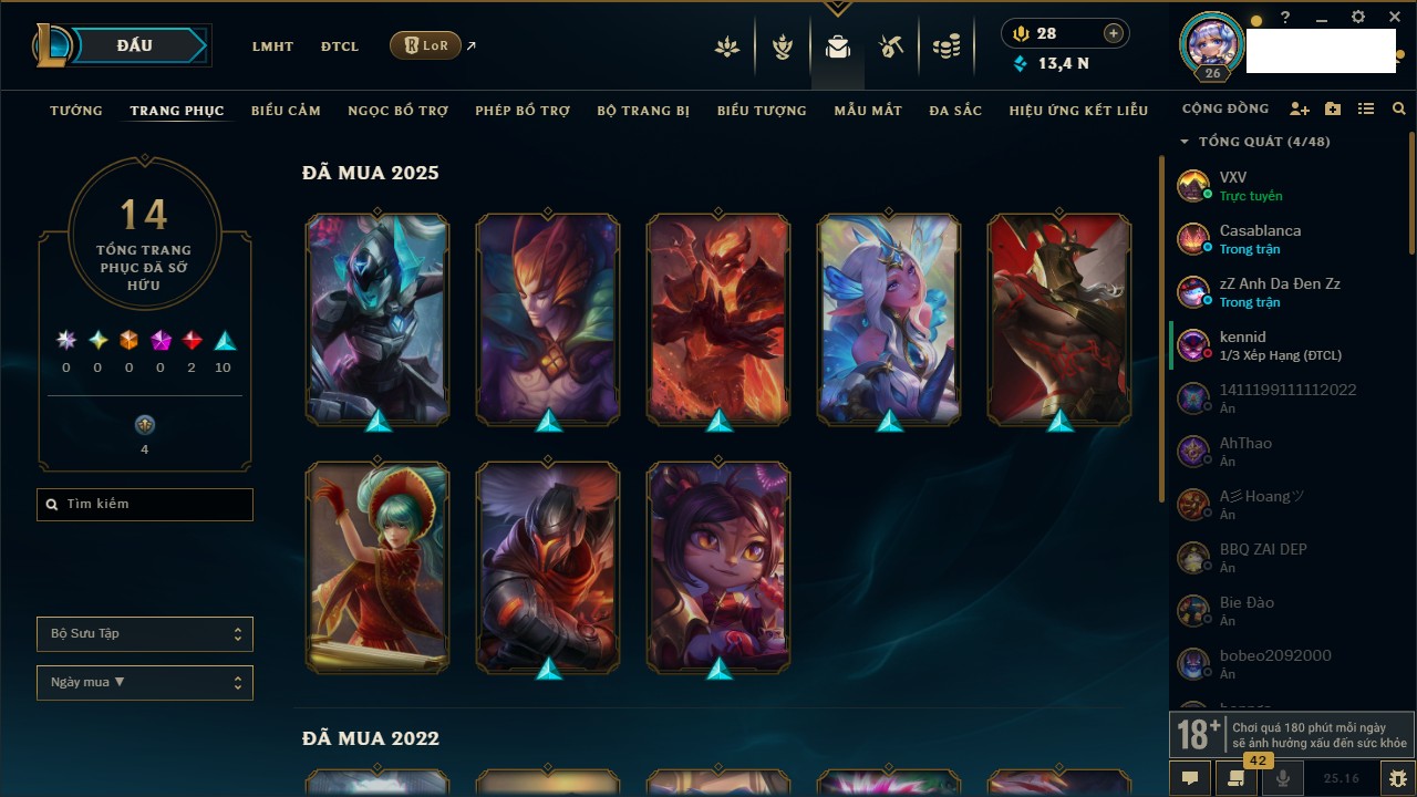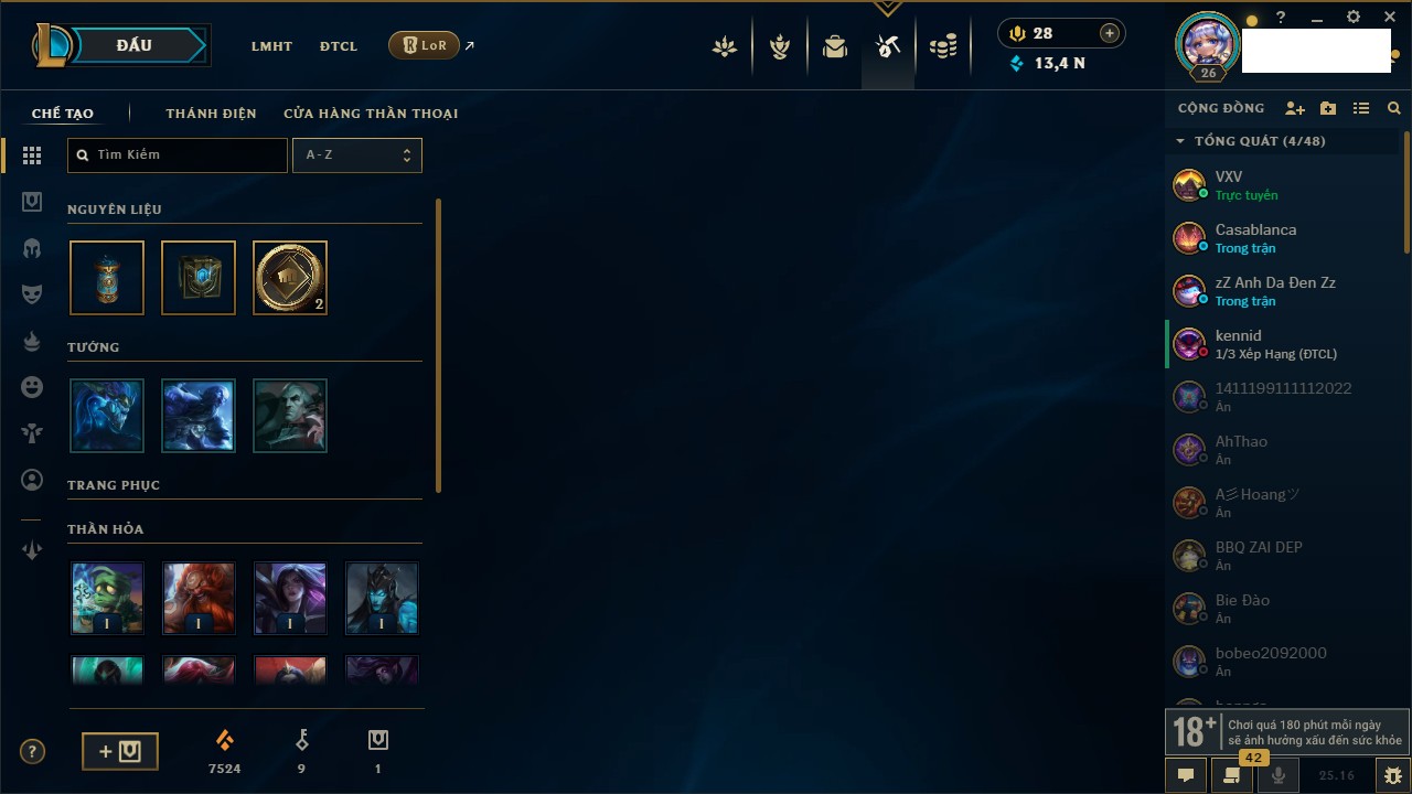 Rank Đơn: Vàng IIIKhung: BạcTướng: 171 - Còn 101359 THXTrang Phục: 88Rank ĐTCL: Kim Cương IVLinh Thú: 200