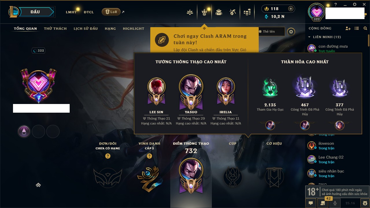 Rank Đơn: Bạch Kim IIKhung: Bạch kimTướng: 171 - Còn 316137 THXTrang Phục: 89Rank ĐTCL: Bạch Kim IIILinh Thú: 94