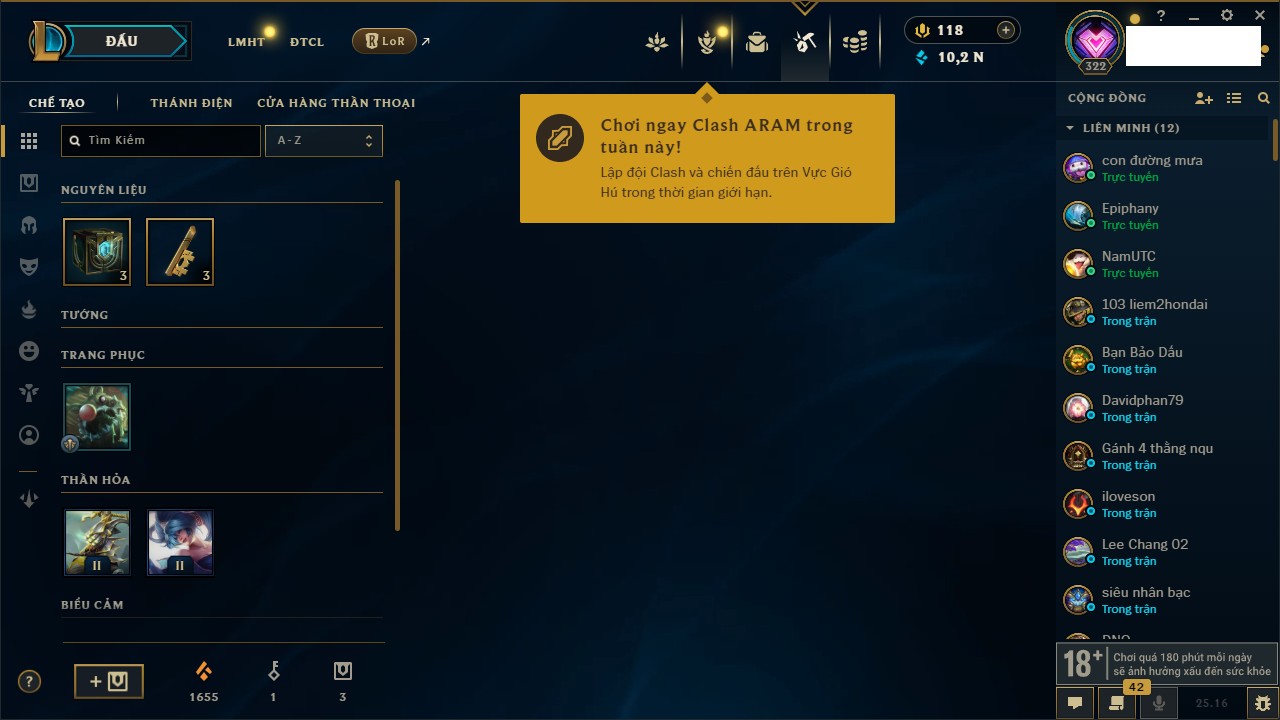 Rank Đơn: Lục Bảo IVKhung: VàngTướng: 171 - Còn 154648 THXTrang Phục: 203Rank ĐTCL: Bạch Kim IVLinh Thú: 69