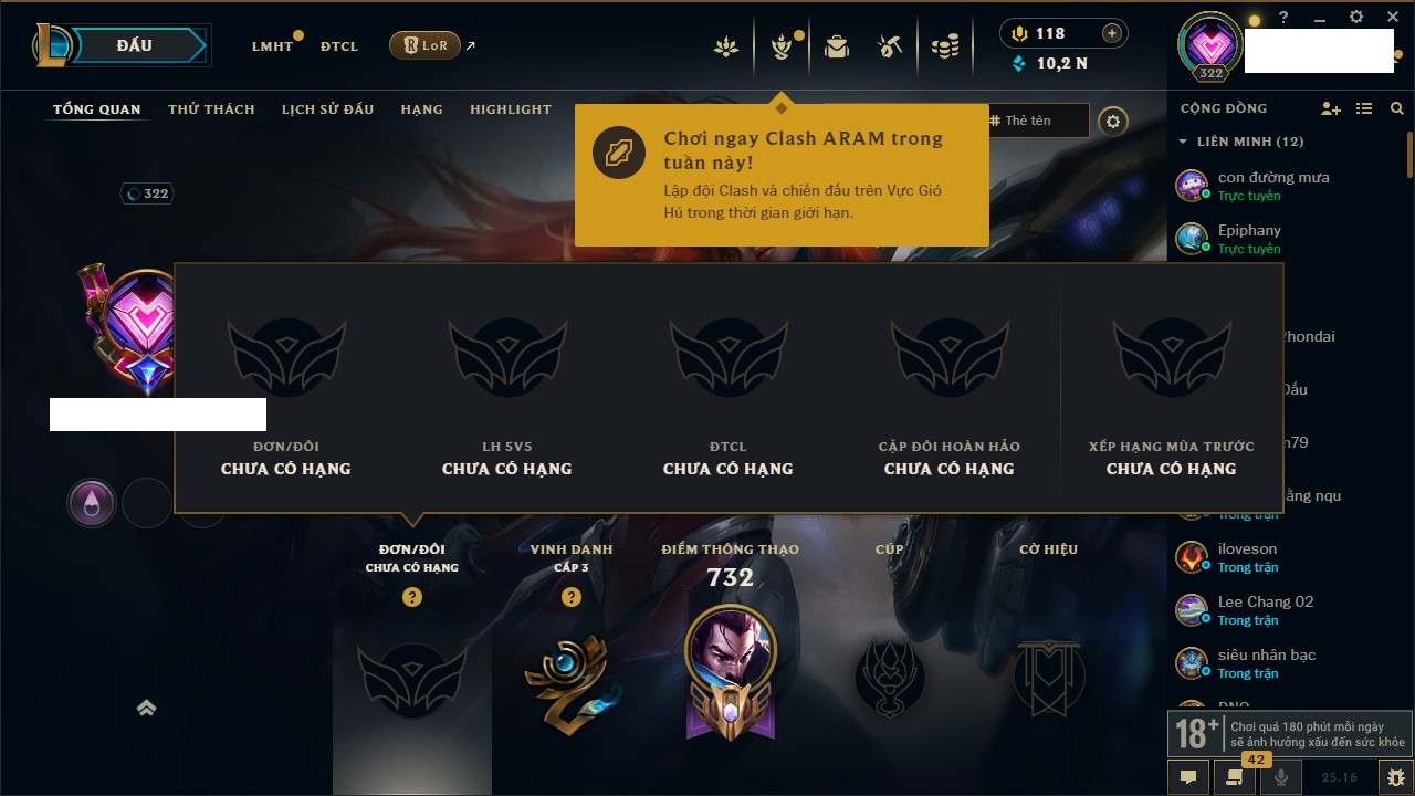 Rank Đơn: Bạc IIIKhung: BạcTướng: 171 - Còn 190352 THXTrang Phục: 260Rank ĐTCL: Sắt IILinh Thú: 31