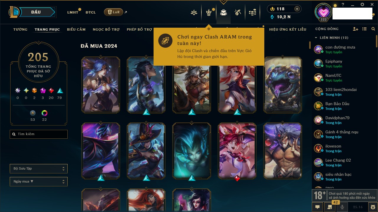 Rank Đơn: Vàng IIIKhung: VàngTướng: 172 - Còn 164704 THXTrang Phục: 255Rank ĐTCL: Kim Cương IVLinh Thú: 156