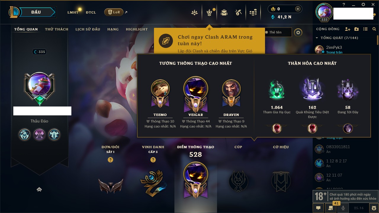 Rank Đơn: Bạch Kim IIKhung: Bạch kimTướng: 171 - Còn 316137 THXTrang Phục: 89Rank ĐTCL: Bạch Kim IIILinh Thú: 94
