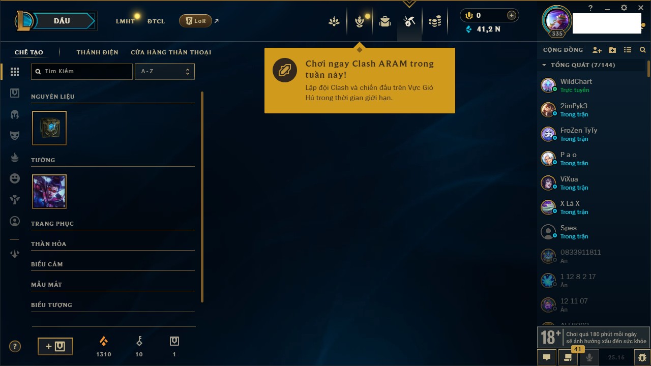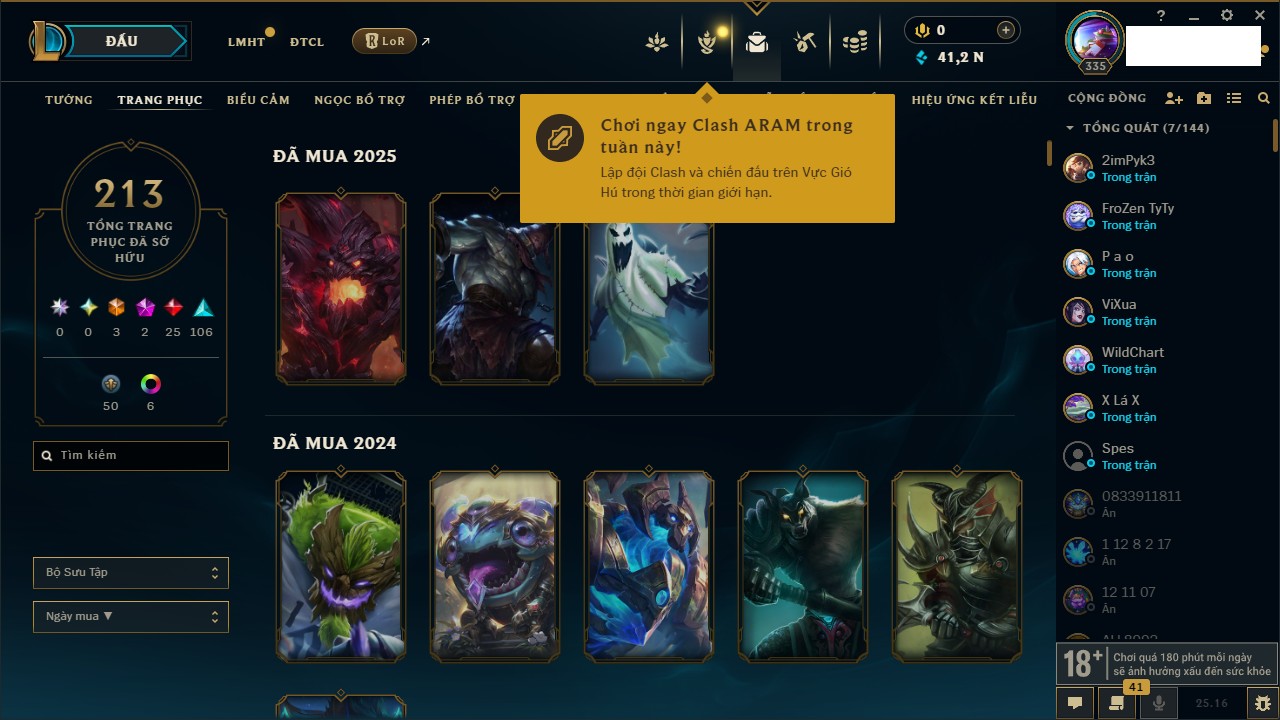 Rank Đơn: Vàng IIIKhung: VàngTướng: 172 - Còn 164704 THXTrang Phục: 255Rank ĐTCL: Kim Cương IVLinh Thú: 156