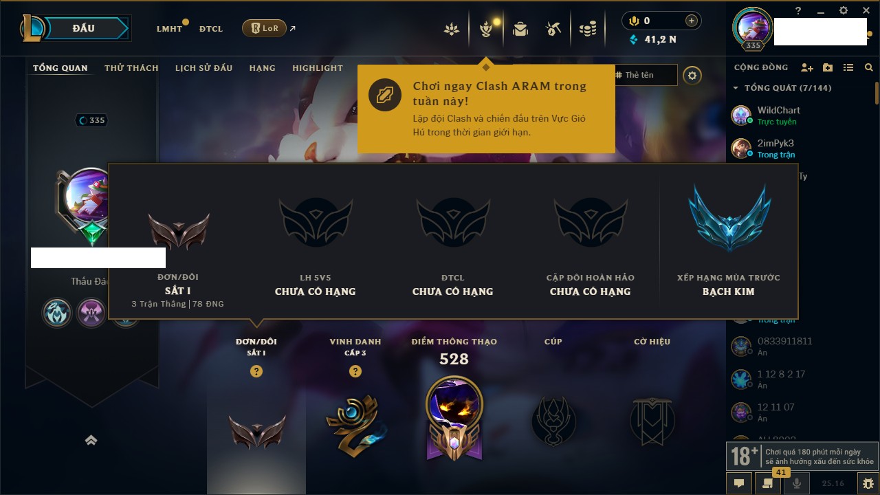 Rank Đơn: Bạch Kim IIIKhung: Bạch kimTướng: 171 - Còn 136108 THXTrang Phục: 261Rank ĐTCL: Bạc IVLinh Thú: 73